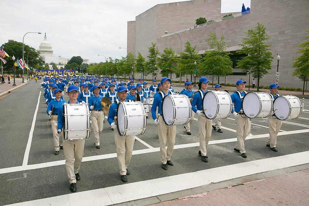 Tian Guo Marching Band je predvodio paradu, a slijedile su ga tematske grupe "Falun Dafa je dobar", "Zaustavite progon Falun Gonga" i "Čestitke za blizu 400 miliona Kineza koji su napustili KPK i njoj pridružene organizacije".
