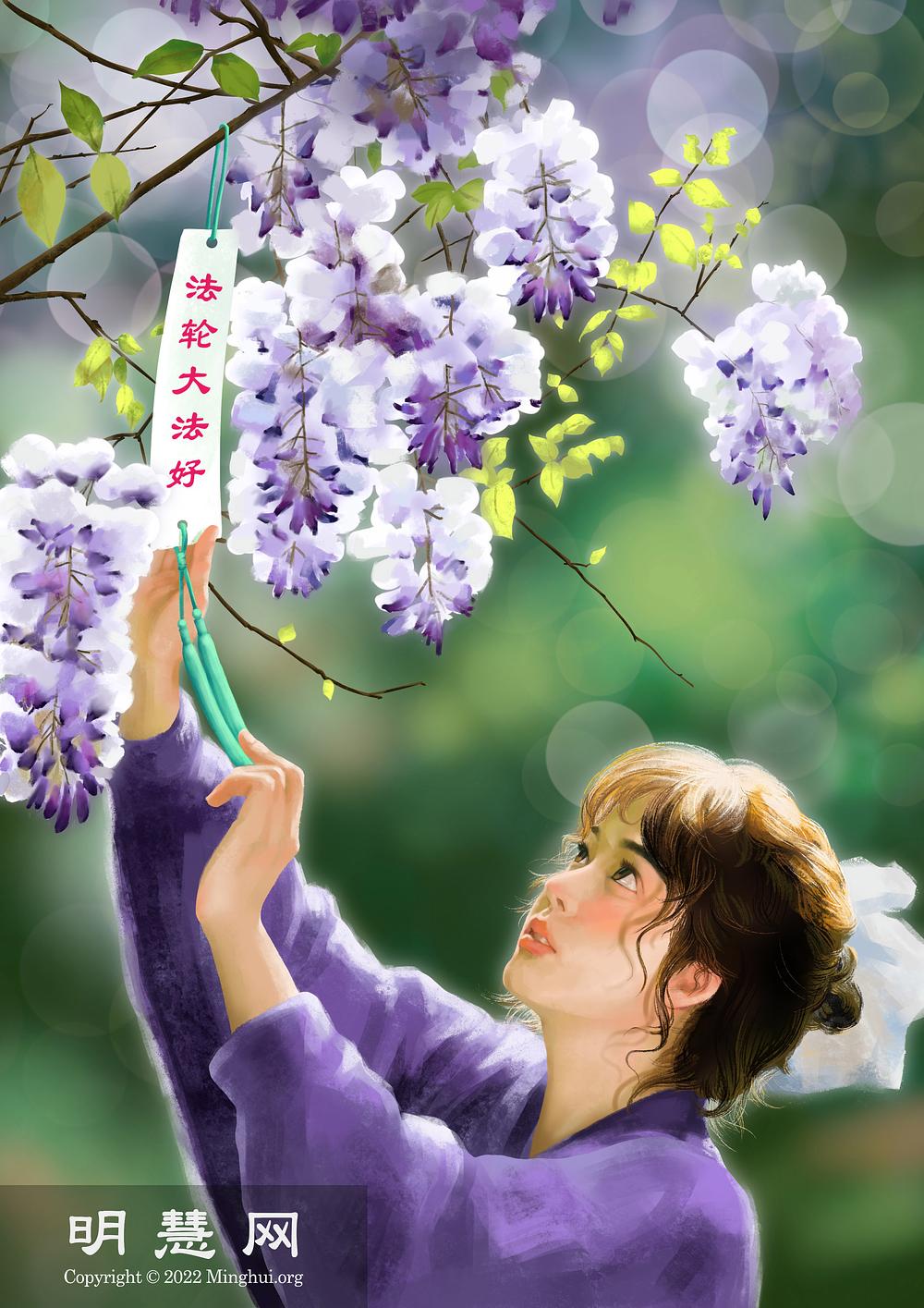 Ljubičasta je povoljna boja u tradicionalnoj kineskoj kulturi. Vješanjem privjeska s riječima „Falun Dafa je dobar“ na stablo, djevojka se nada da će više ljudi cijeniti Falun Dafa i njegova načela Istinitosti-Dobrodušnosti-Tolerancije, dok se odriču klevetničke propagande Komunističke partije Kine, u progonu koji traje 23 godine.
