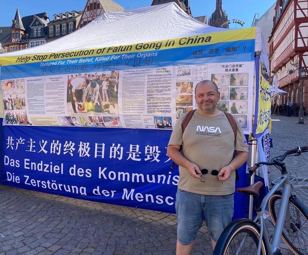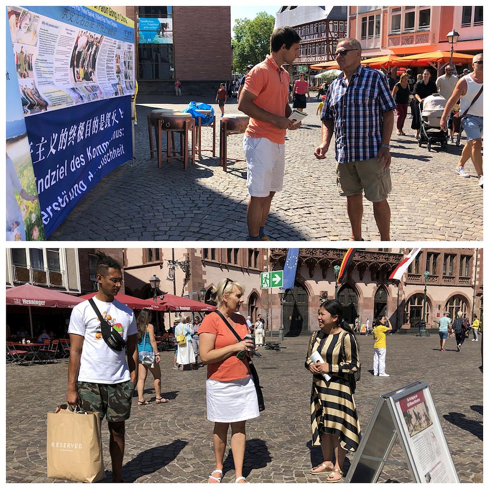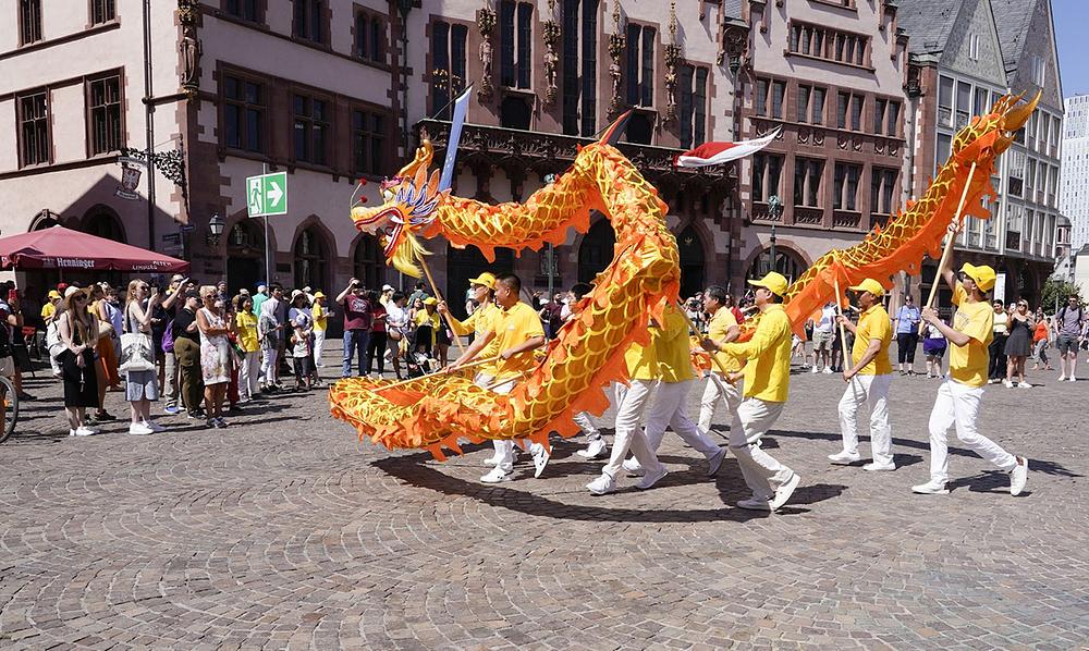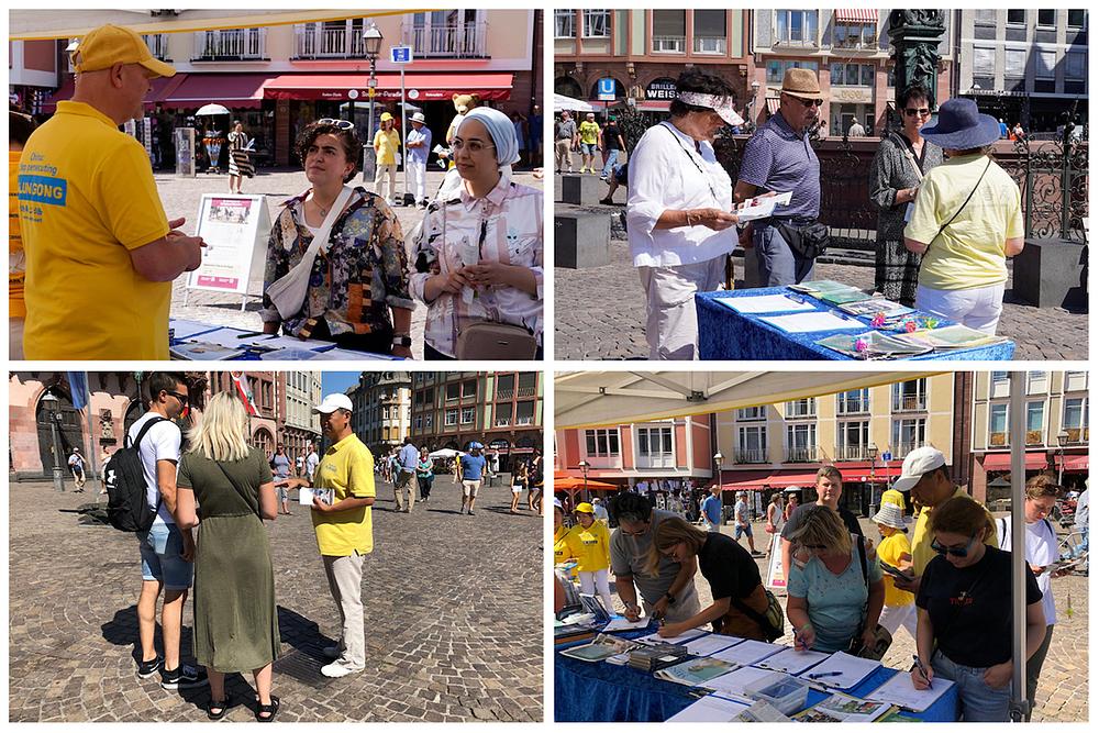 Falun Dafa praktikanti okupili su se u Römerberg-u u Frankfurtu, njemačkom financijskom središtu, 13. kolovoza 2022., kako bi proslavili 400 milijuna ljudi koji su se povukli iz Komunističke partije Kine (KPK). Ovi dnevni događaji uključivali su skup, govore, plesove zmajeva, plesne izvedbe bubnjeva i demonstracije vježbi. Praktikanti su dijelili letke, objašnjavali važnost ovih aktivnosti i skupljali potpise na peticiji za prekid progona u Kini.