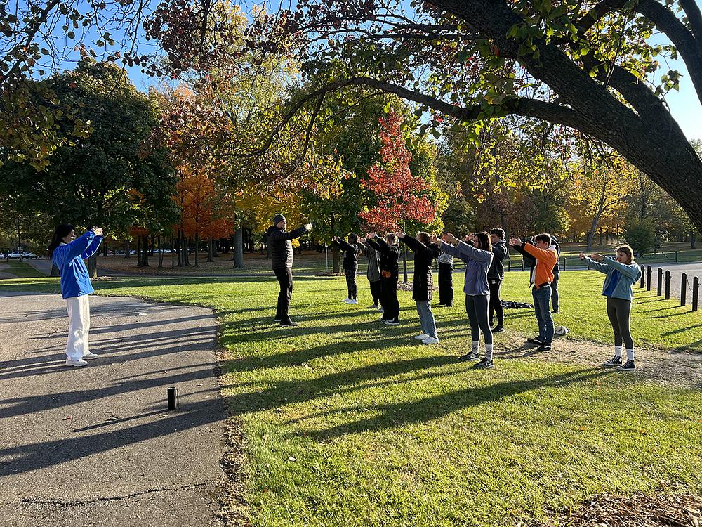Dvanaest studenata i njihova profesorica sa Univerziteta Rochester su, 22. oktobra 2022., došli da posmatraju Falun Dafa praktikante kako rade vježbe na mjestu za grupno vježbanje u Troyi. Profesorica Carol Cooper i njeni studenti sa časova Svjetske religije naučili su pokrete vježbi i informirali se aktuelnom progonu Falun Dafa u Kini.