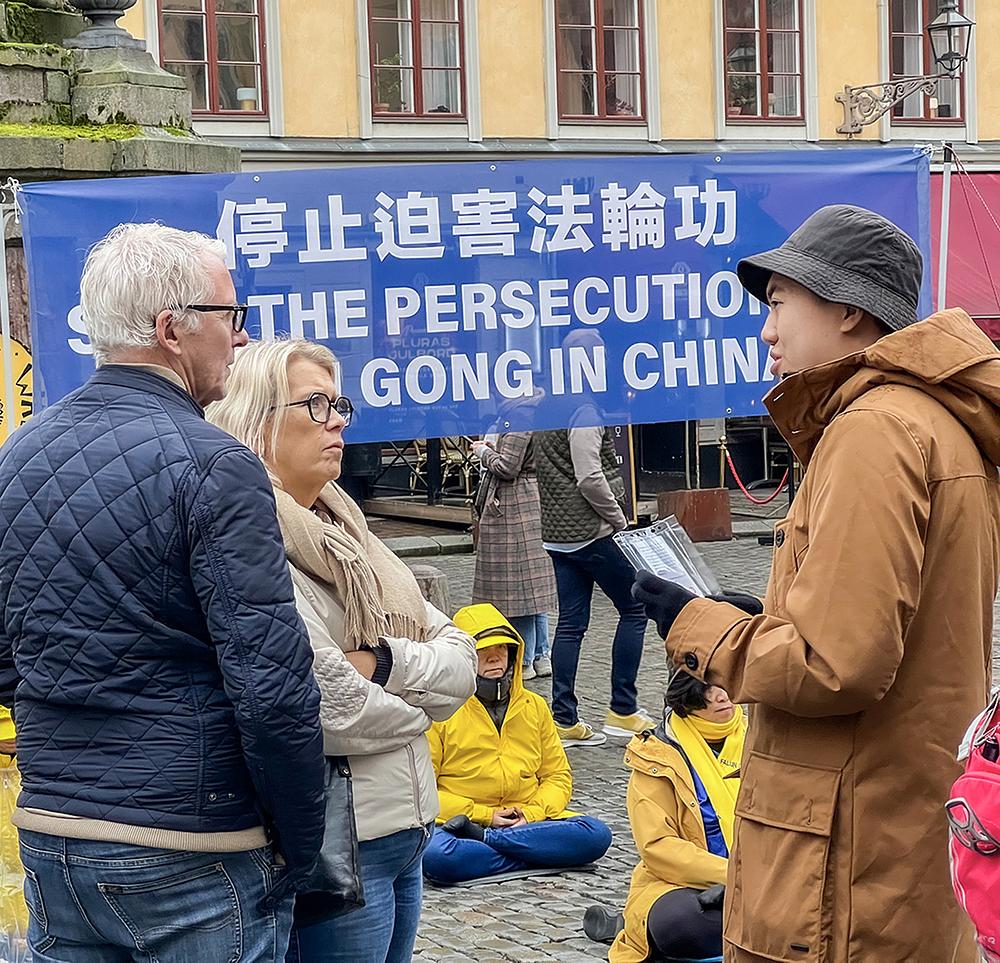 Sezona zlatne jeseni odlično je vrijeme za putovanje u Švedsku, a dobitnici Nobelove nagrade za mir objavljuju se u listopadu. Turisti iz cijelog svijeta i lokalno stanovništvo mogli su vidjeti kako Falun Dafa praktikanti predstavljaju praksu uma i tijela ispred Muzeja Nobelove nagrade svakog petka i subote poslijepodne u listopadu. Mnogi su ljudi izrazili svoje poštovanje prema nepokolebljivoj upornosti praktikanata u razotkrivanju progona u Kini. Mnogi od njih potpisali su peticiju kojom pozivaju na prestanak zločina.