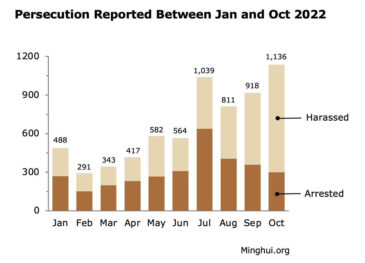 U septembru i oktobru 2022. prijavljena su 2.054 slučaja hapšenja ili maltretiranja Falun Gong praktikanata zbog njihove vere.