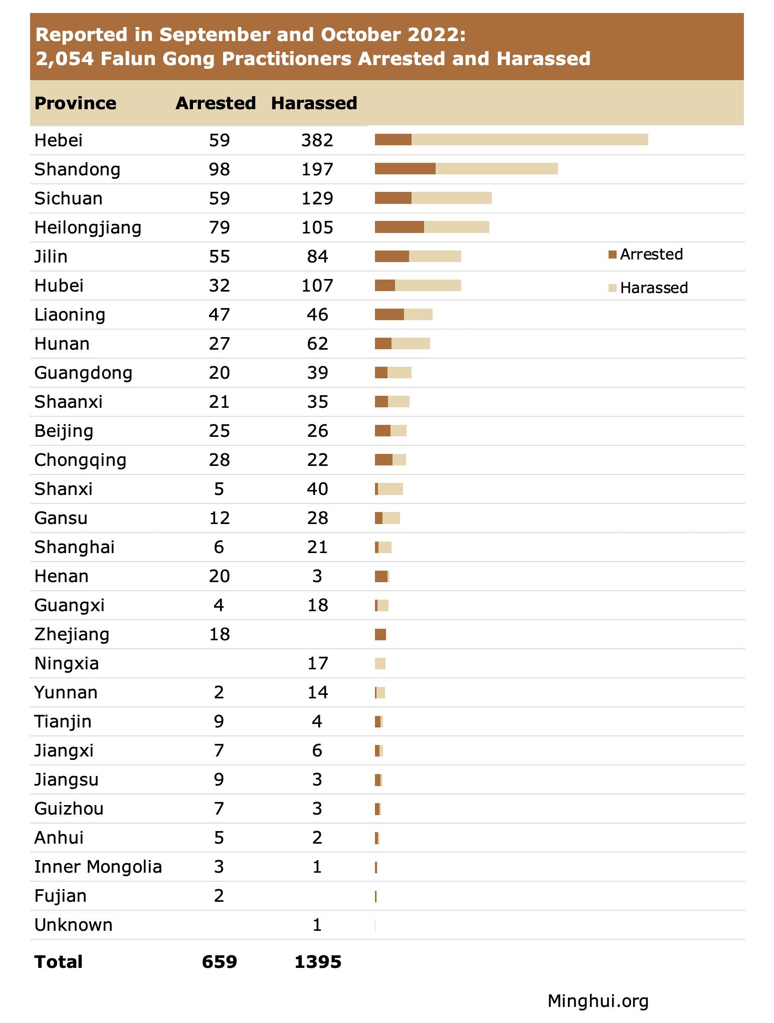 Među novopotvrđenim slučajevima progona u septembru i oktobru 2022. godine, šest provincija je registrovalo trocifreni broj slučajeva, uključujući Hebei (441), Šandong (295), Sečuan (188), Heilongđang (184), Jilin (139) i Hubei (139). Osamnaest drugih pokrajina ili opština imalo je dvocifrene slučajeve, a tri regiona jednocifrene. Lokacija jednog slučaja uznemiravanja nije poznata.