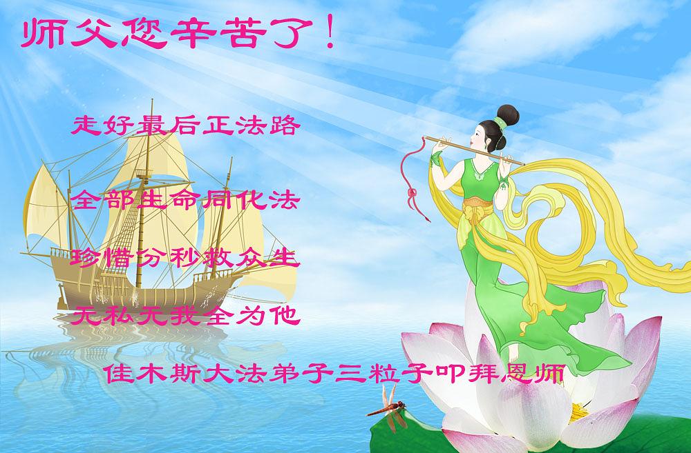 Pozdravi su također stigli Učitelju od porodice od pet praktikanata, grupe za učenje Fa iz Meijianga; porodice od tri praktikanta; grupe za učenje Fa iz Hanmei-ja iz oblasti Jianan.