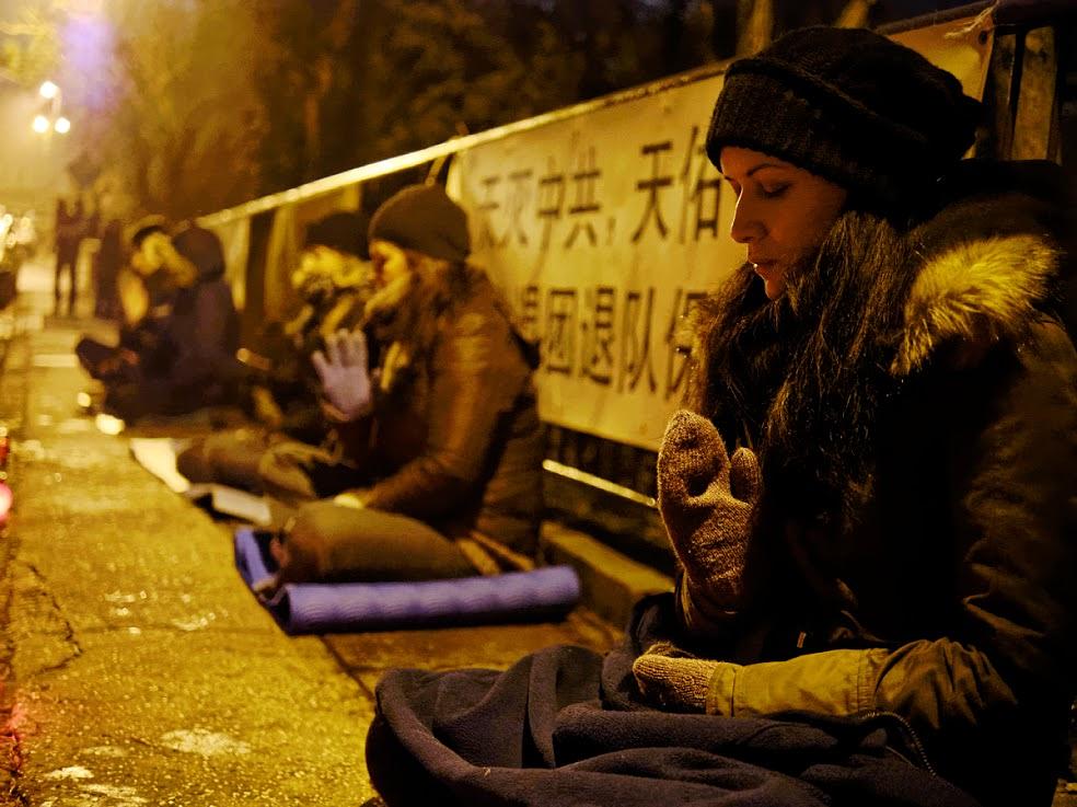 Slovački praktikanti su dočekali novu 2014. godinu ispred kineskog veleposlanstva u Bratislavi. Svijetlo svijeća je osvjetljavalo natpise ispred kojih je grupa praktikanata radila Falun Gong vježbe.