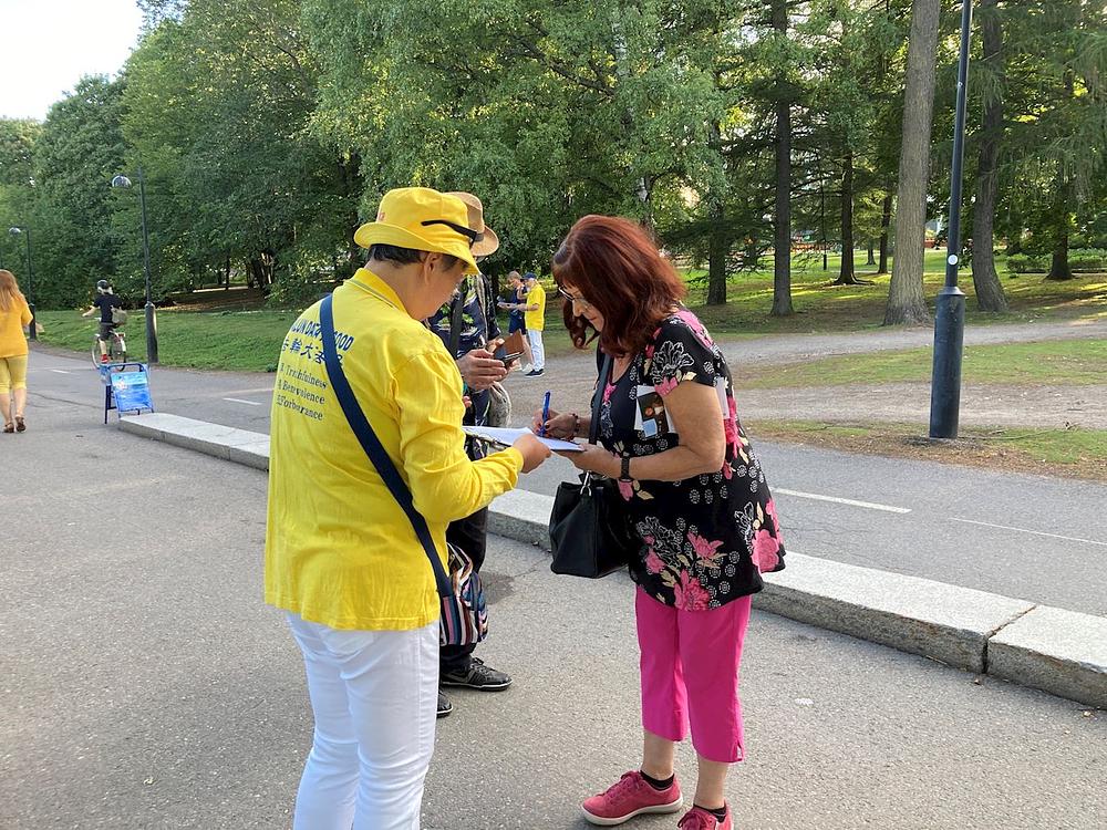 Jedna Finkinja i njena dva prijatelja iz SAD-a i Holandije slučajno su naišli pored izložbe plakata. Žena je rekla da je žetva organa od živih ljudi užasna, ali nije bila iznenađena što KPK čini takav zločin. Sve troje su potpisali peticiju i poželjeli da praktikanti dobiju više potpisa i pažnje javnosti.