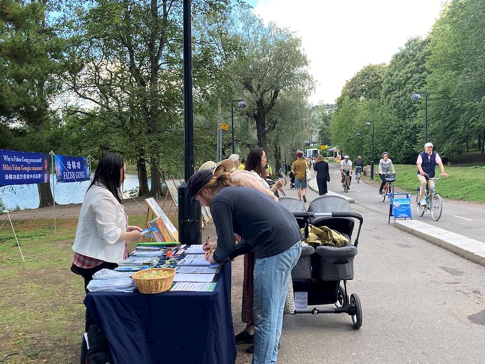 Izložba postera „Zaustavite prisilnu žetvu organa“, u organizaciji Falun Dafa asocijacije Finske, je održana u Hesperia Parku u Helsinkiju po prvi put tokom godišnjeg Helsinškog festivala 17. avgusta 2023. godine.