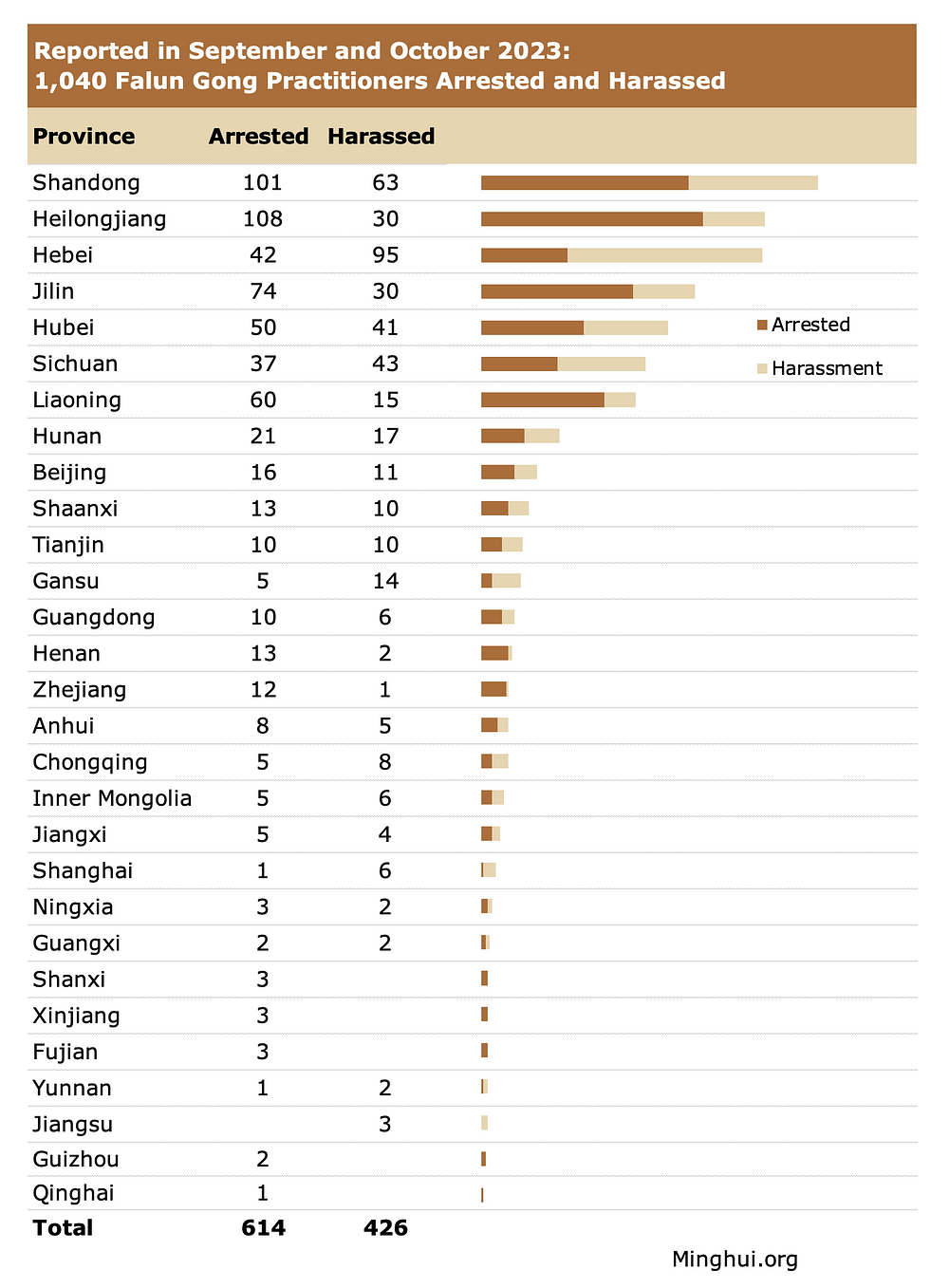 Novoprijavljeni slučajevi dogodili su se u 25 provincija i 4 okruga pod središnjom upravom (Peking, Chongqing, Shanghai i Tianjin). Shandong je izvijestio o većini kombiniranih slučajeva (164) uhićenja i uznemiravanja, zatim 138 u Heilongjiangu, 137 u Hebeiju i 104 u Jilinu. U četrnaest regija zabilježen je dvoznamenkasti broj slučajeva (11 i 91). Još jedanaest regija bilježi jednoznamenkasti broj slučajeva (1 i 9).