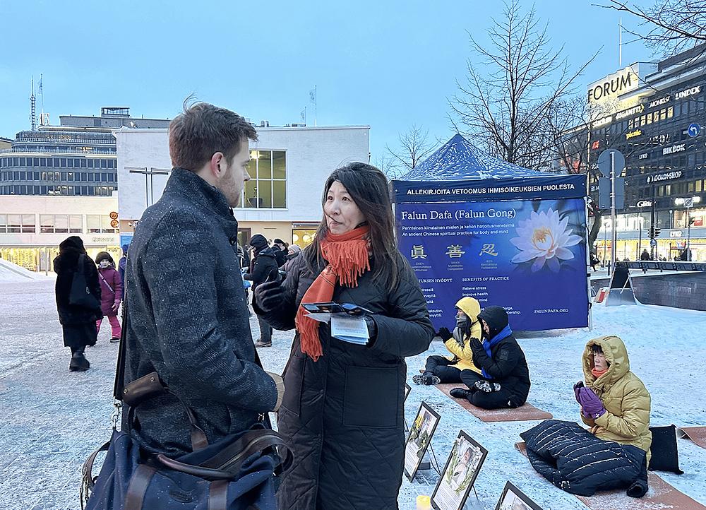 Na Međunarodni dan ljudskih prava, 10. decembra 2023., Falun Gong praktikanti u Finskoj održali su aktivnosti ispred kineske ambasade i u prometnom trgovačkom kvartu Kamppi u Helsinkiju. Oni su pozvali na prekid progona Falun Gonga od strane Komunističke partije Kine (KPK).