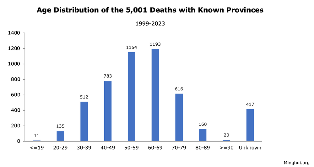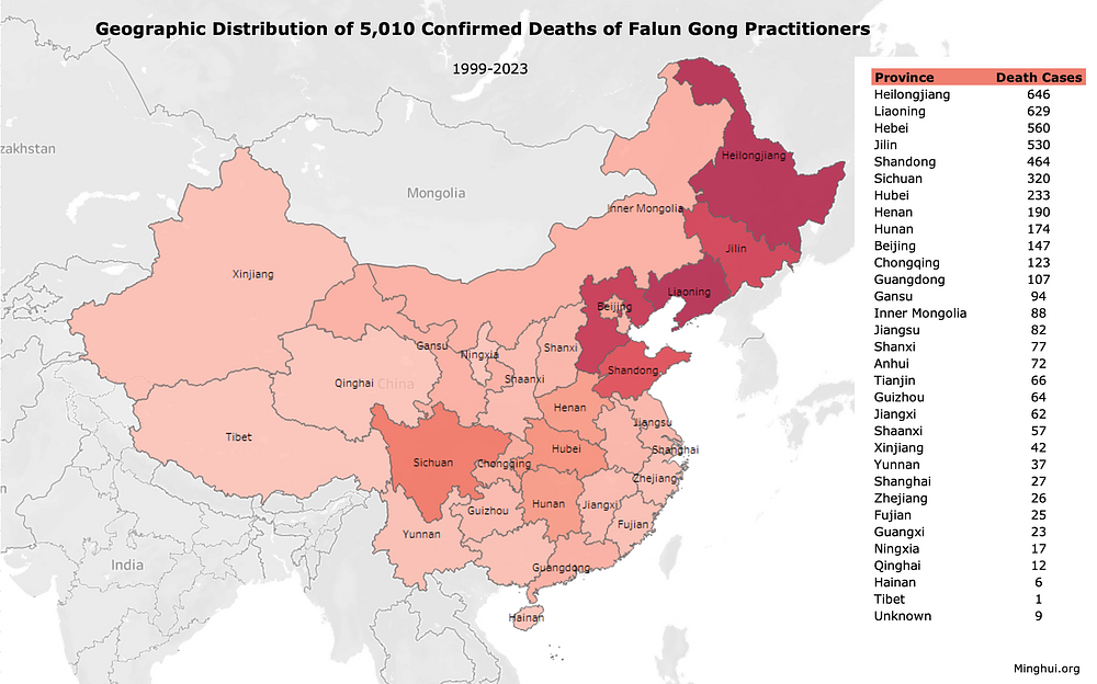 Heilongjiang, najsjevernija pokrajina, prijavila je najveći broj umrlih od 646; Liaoning, još jedna sjeveroistočna pokrajina, imala je drugi najveći broj slučajeva od 629; Hebei, šesta najnaseljenija kineska pokrajina koja okružuje Peking, imala je treću po broju smrtnih slučajeva od 650; Jilin, rodno mjesto Falun Gonga, nalazi se na četvrtom mjestu s 530 smrtnih slučajeva; i Shandong, druga po broju stanovnika i poljoprivredna pokrajina, imala je 464 slučaja.