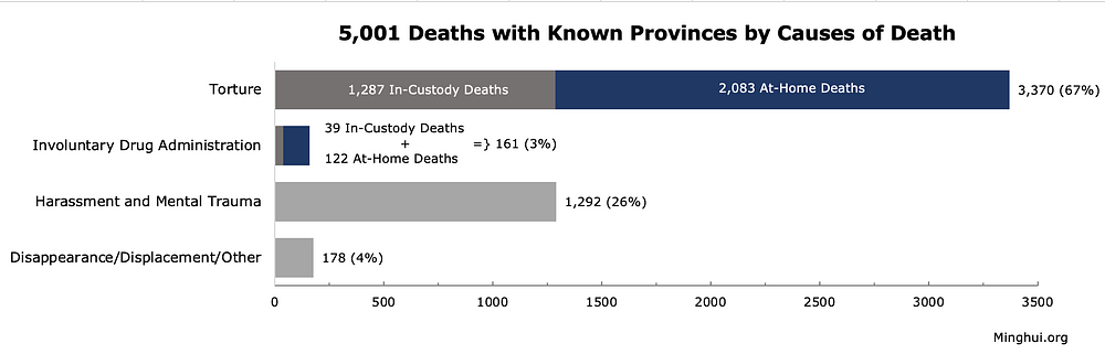 Uzroci smrti 5001 praktikanta uključuju mučenje (3.370), prisilno uzimanje droga (161), uznemiravanje i mentalnu traumu (1.292), te nestanak/premještanje/drugo (178). Važno je napomenuti da su mnogi preminuli praktikanti bili podvrgnuti više od jedne vrste progona, a distribucija prema uzrocima smrti temeljila se na najtežoj ozljedi koja im je nanesena.