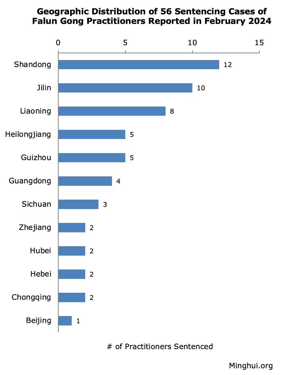 Osuđeni Falun Gong praktikanti su iz 12 provincija ili opština pod centralnom kontrolom. U poređenju sa slučajevima izricanja kazni prijavljenim u januaru 2024., Šandong i Jilin su ostale dve najveće provincije, sa najviše slučajeva od 12 odnosno 10. Preostalih deset regiona imalo je između 1 i 8 slučajeva.