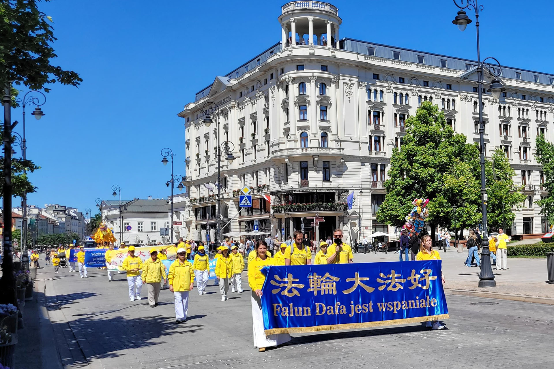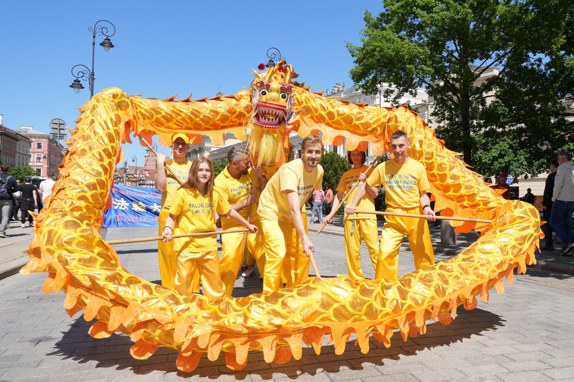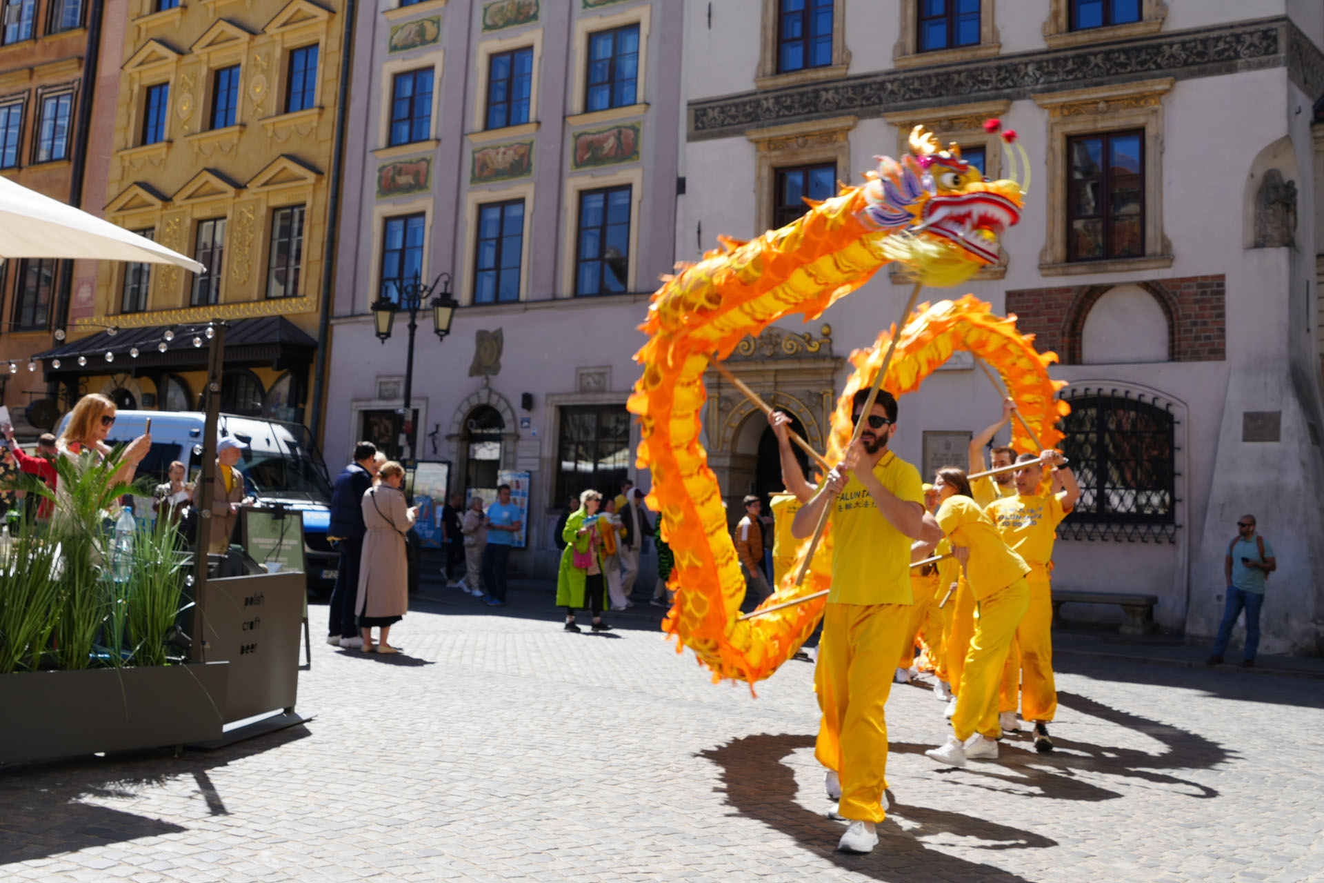 Praktikanti su u Poljskoj, 12. maja 2024., održali ktivnosti na Starom gradskom trgu u Varšavi kako bi proslavili 32. godišnjicu predstavljanja Falun Dafa javnost, koja je ujedno i Svjetski dan Falun Dafa.