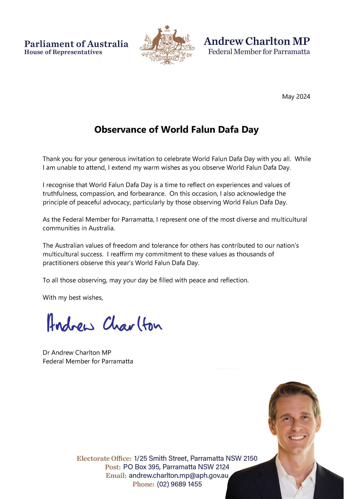 Dr. Andrew Charlton je napisao: “Prepoznajemo da je Svjetski dan Falun Dafa vrijeme za razmišljanje o iskustvima i vrijednostima Istinitosti-Dobrodušnosti i Toleranciji.”