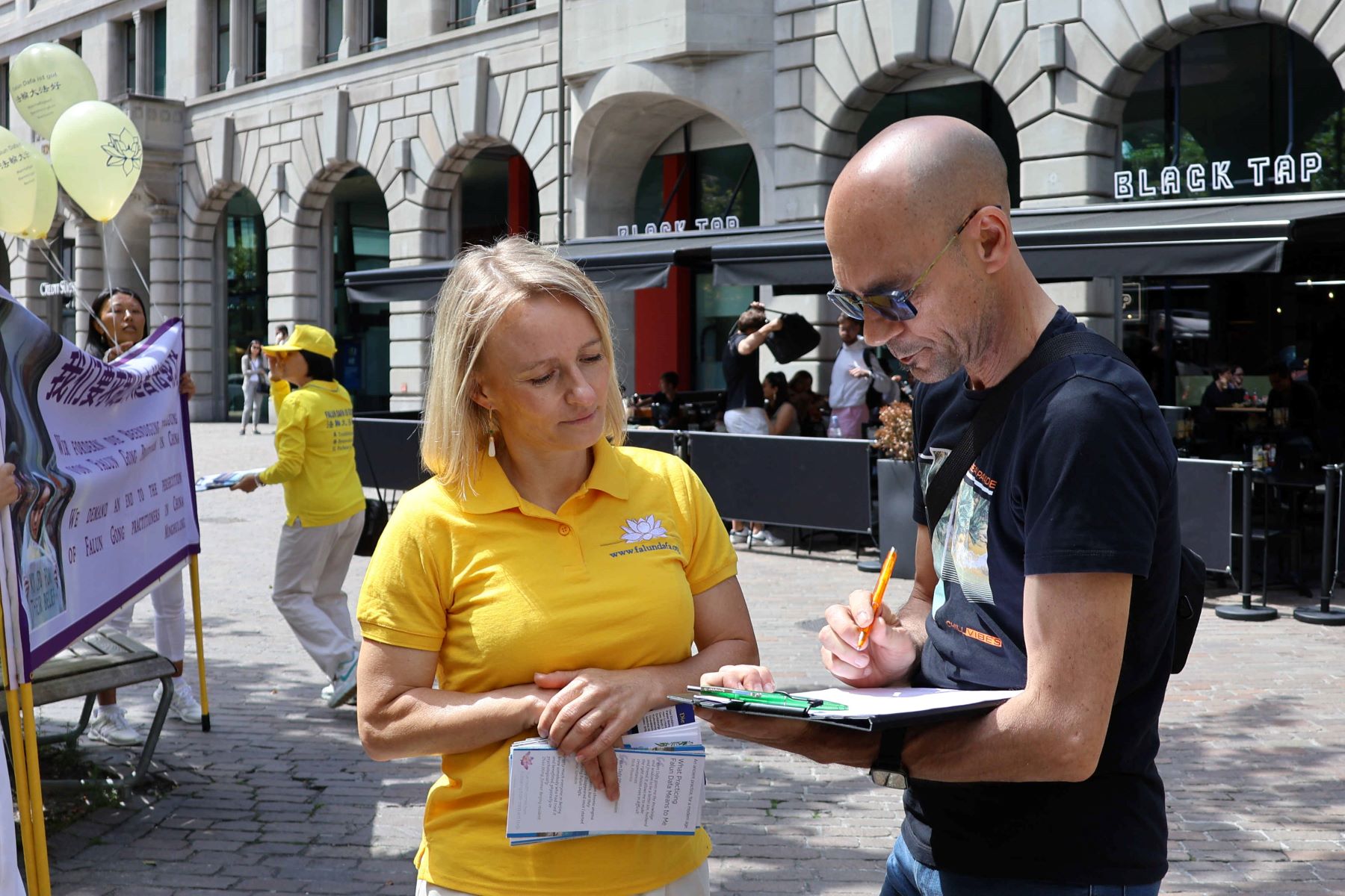 Gosti koji su obedovali u restoranima i prolaznici oko trga mogli su da čuju o Falun Dafi i Dafinim principima istinitosti, blagosti, trpeljivosti.