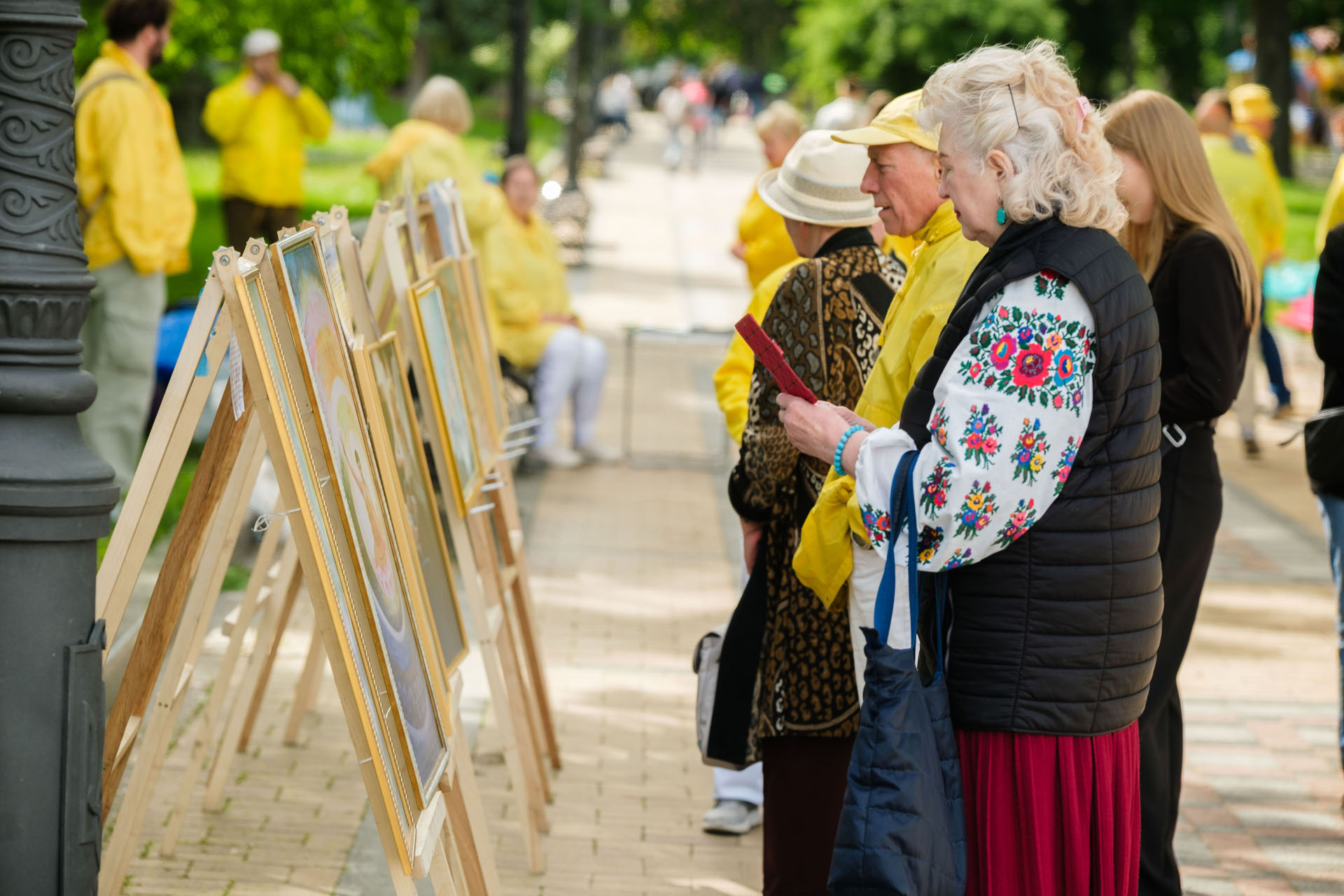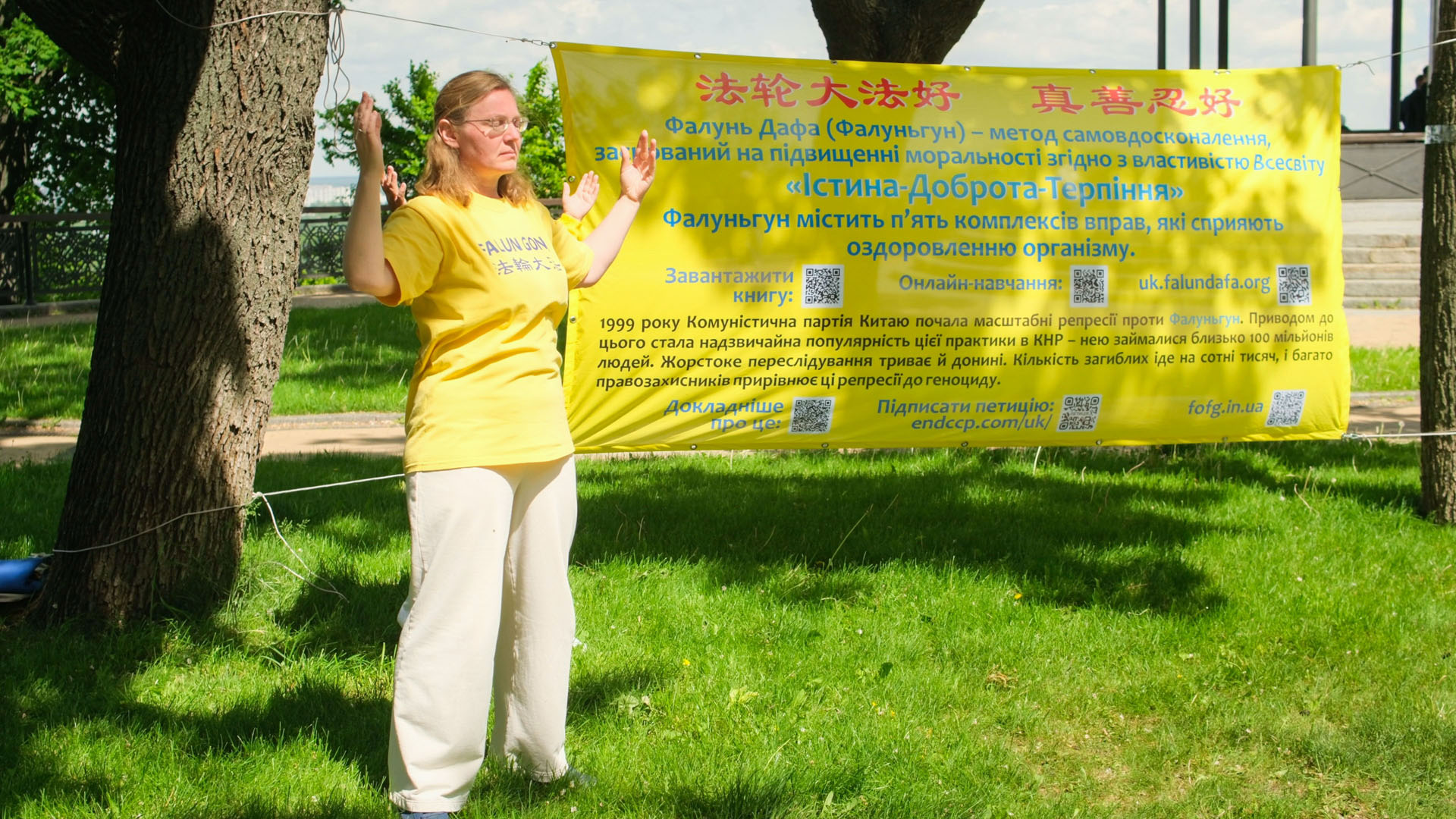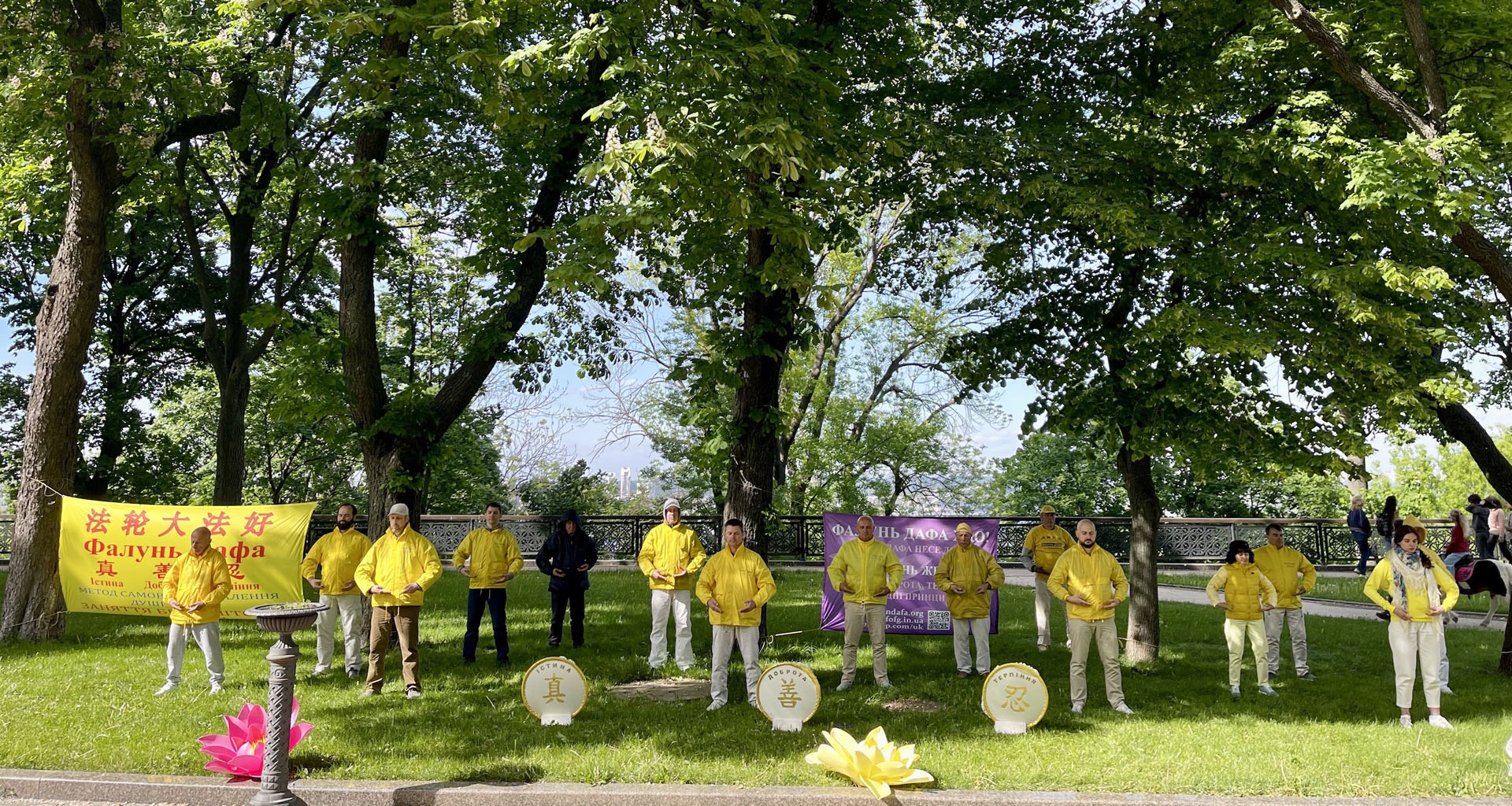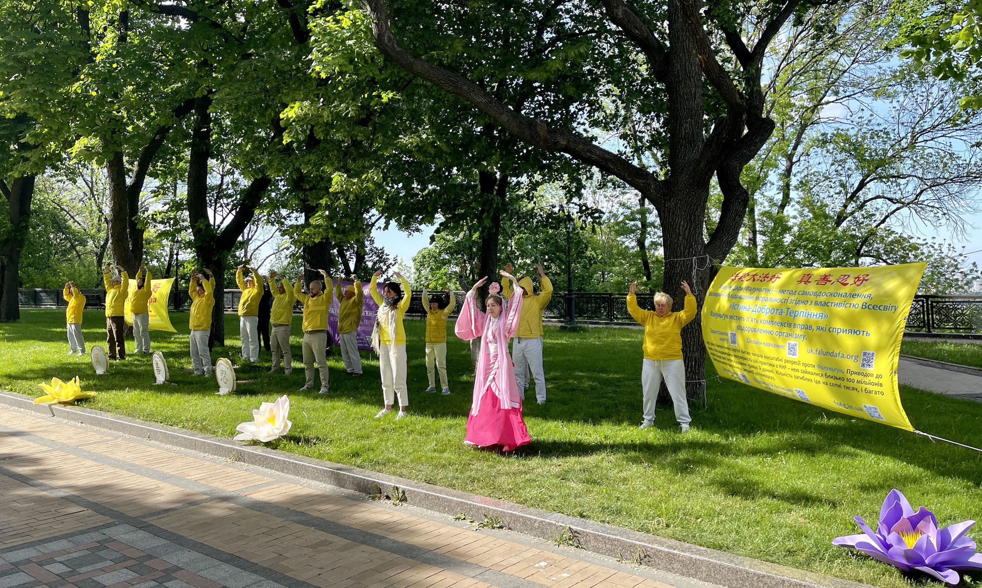 Praktikanti iz različitih dijelova Ukrajine okupili su se, 11. maja 2024., u parku Volodimirska Gorka u centru Kijeva kako bi proslavili 25. Svjetski dan Falun Dafa.