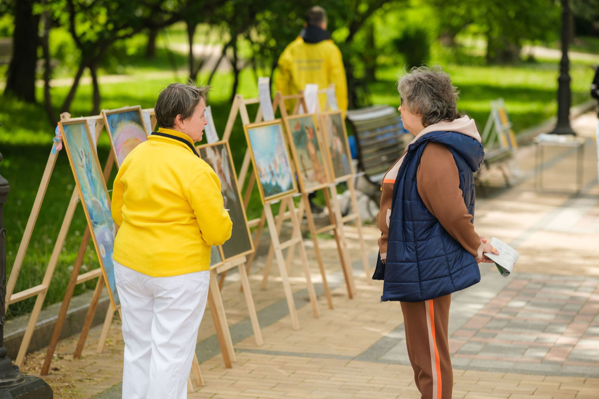 Park je veoma slikovit, ispunjen zelenim, sjenovitim drvećem. Odjeveni u jarko žute jakne, praktikanti su demonstrirali izvođenje pet vježbi, dijelili letke i objašnjavali ljudima šta je Falun Dafa. Također su prikazali umjetničke radove sa izložbe Umjetnost Zhen Shen Ren (Istinitost, Dobrodušnost, Tolerancija). Slike koje su kreirali umjetnici praktikanti prikazuju ljepotu Falun Dafa i otpor praktikanata pred brutalnim progonom u Kini.
