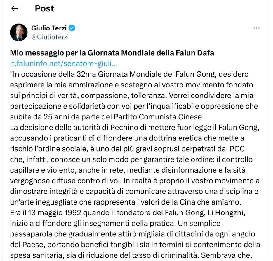 U postu je napisao: „Povodom 32. Svetskog dana Falun Gonga, želeo bih da izrazim svoje divljenje i podršku vašem pokretu koji je zasnovan na principima istinitosti, blagosti, trpeljivosti. Želeo bih da podelim sa vama svoje saosećanje i solidarnost zbog neopisivog ugnjetavanja koje trpite od Komunističke partije Kine već 25 godina.