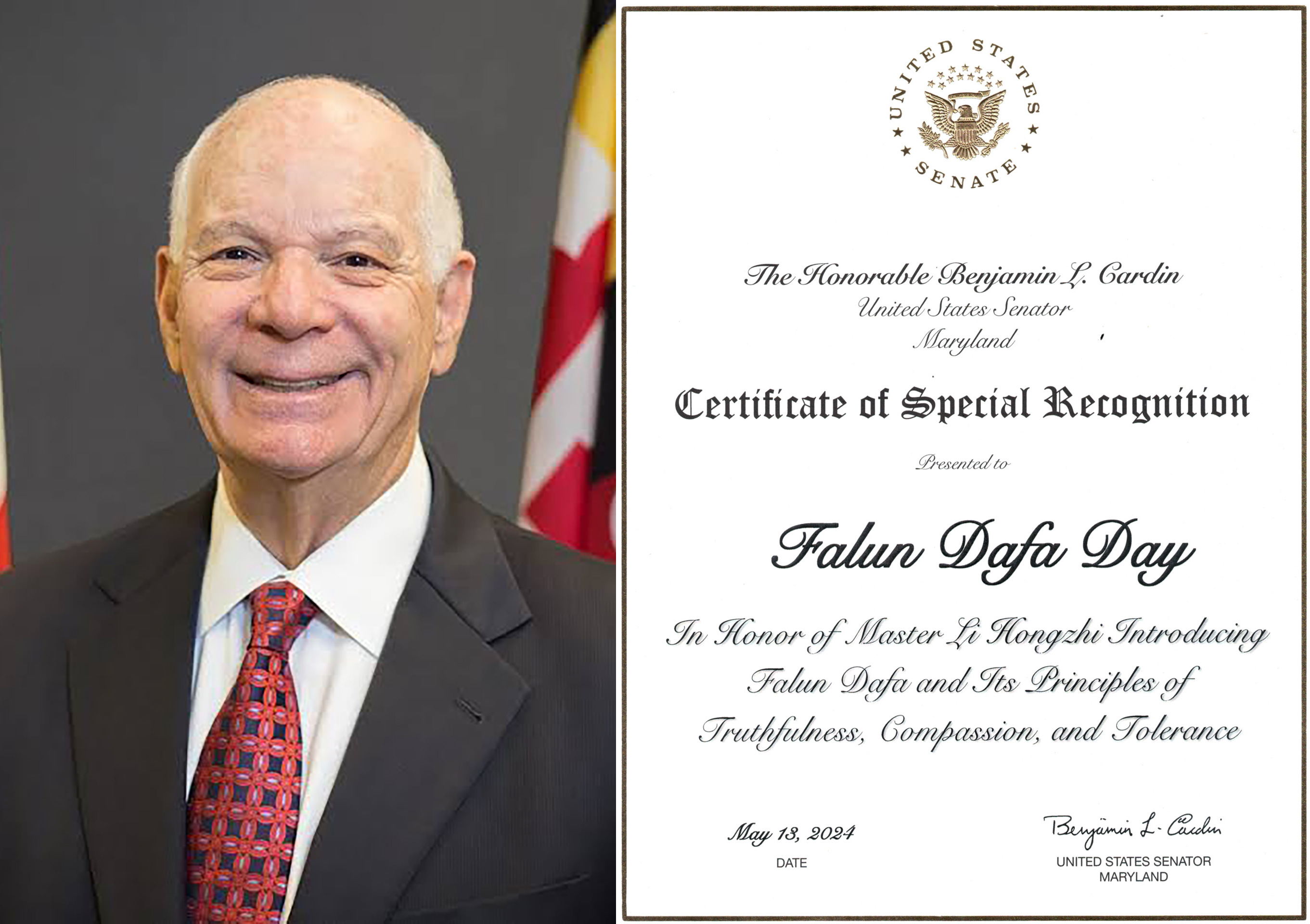 SAD Senator Ben Cardin iz Marylanda je izdao Potvrdu o posebnom priznanju, “u čast Učitelja Li Hongzhija koji je predstavio Falun Dafa i njegove principe Istinitosti, Dobrodušnosti i Tolerancije.”