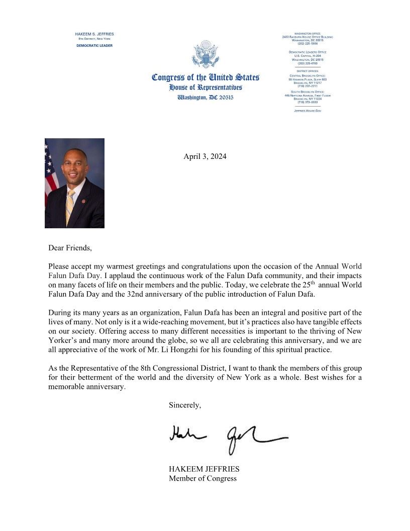Zastupnik iz New Yorka Hakeem Jeffries je u svom pismu podrške izjavio: “Tokom svojih mnogih godina kao organizacija, Falun Dafa je bio sastavni i pozitivan dio života mnogih. Ne samo da je to pokret širokog dometa, već njegove prakse imaju i opipljive efekte na naše društvo. Nuđenje pristupa mnogim različitim potrepštinama važno je za napredak Njujorčana i mnogih drugih širom svijeta, tako da svi slavimo ovu godišnjicu i svi cijenimo rad g. Li Hongzhija na njegovom osnivanju ove duhovne prakse.