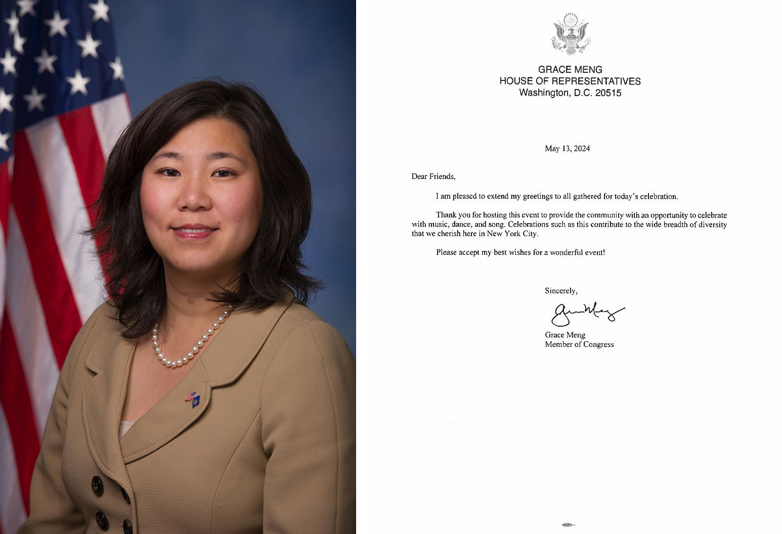 Pismo zastupnice Grace Meng iz New Yorka glasi: „Hvala vam što ste bili domaćin ovome događaju kako biste zajednici pružili priliku da proslavi uz muziku, ples i pjesmu. Proslave poput ove doprinose širokoj širini raznolikosti koju njegujemo ovdje u New Yorku.”