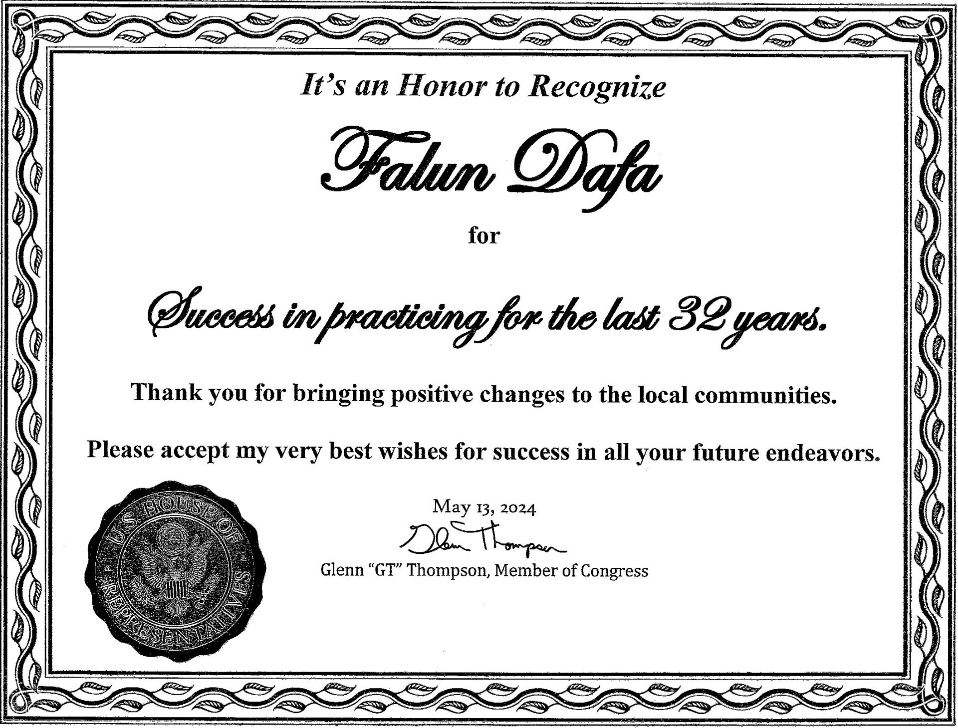 Kongresmen Thompson iz Pensilvanije je napisao: “Čast je odati priznanje Falun Dafa za uspjeh u prakticiranju u posljednje 32 godine. Hvala vam što unosite pozitivne promjene u lokalne zajednice. Primite moje najbolje želje za uspjeh u svim vašim budućim nastojanjima.”