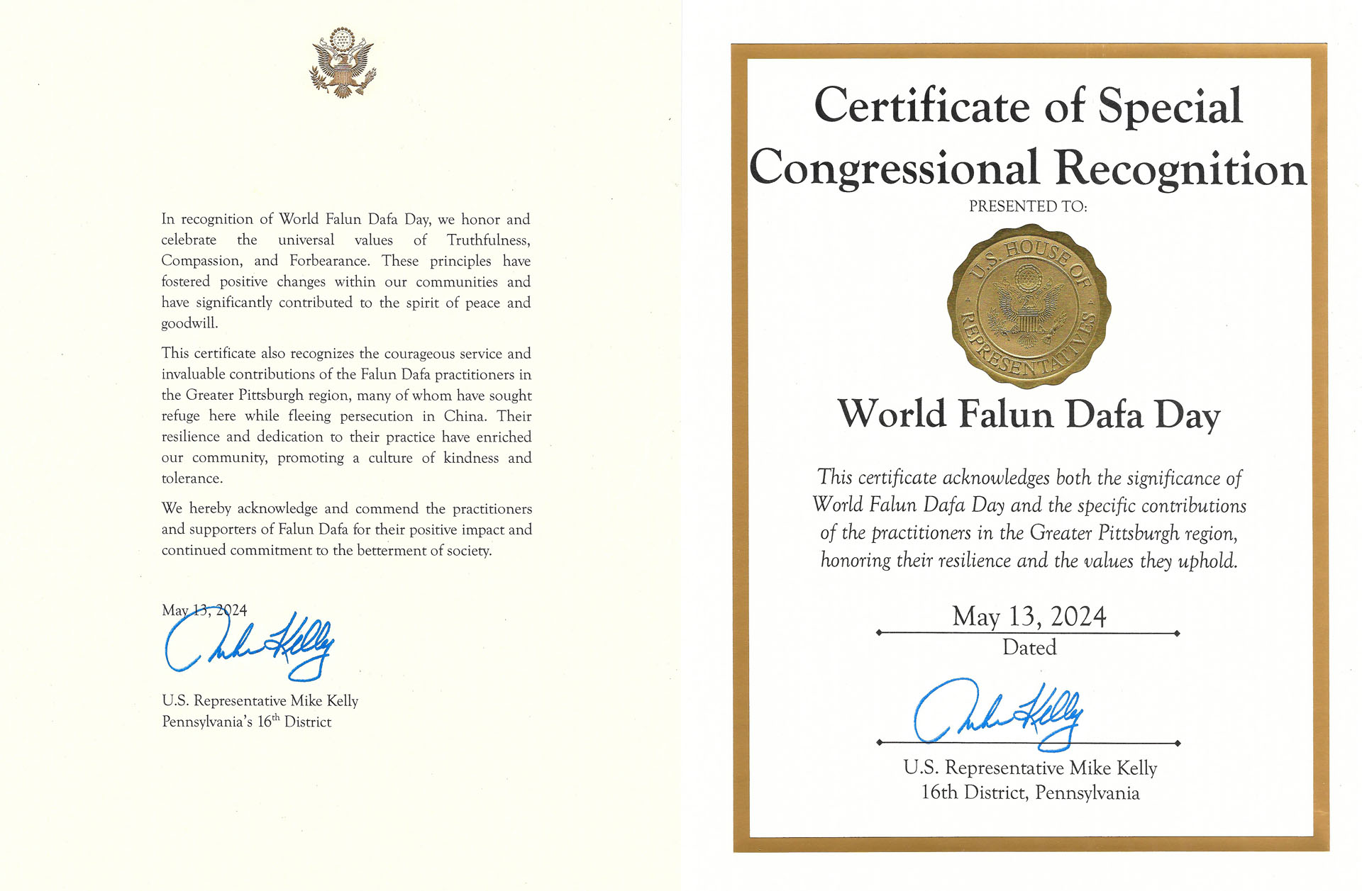 Zastupnik Mike Kelly iz Pennsylvanije je napisao: “Ovaj certifikat odaje priznanje kako Svjetskom danu Falun Dafa kao i specifičnom doprinosu praktikanata u regiji Greater Pittsburgh, odajući počast njihovom prebivalištu i vrijednostima koje zastupaju.”