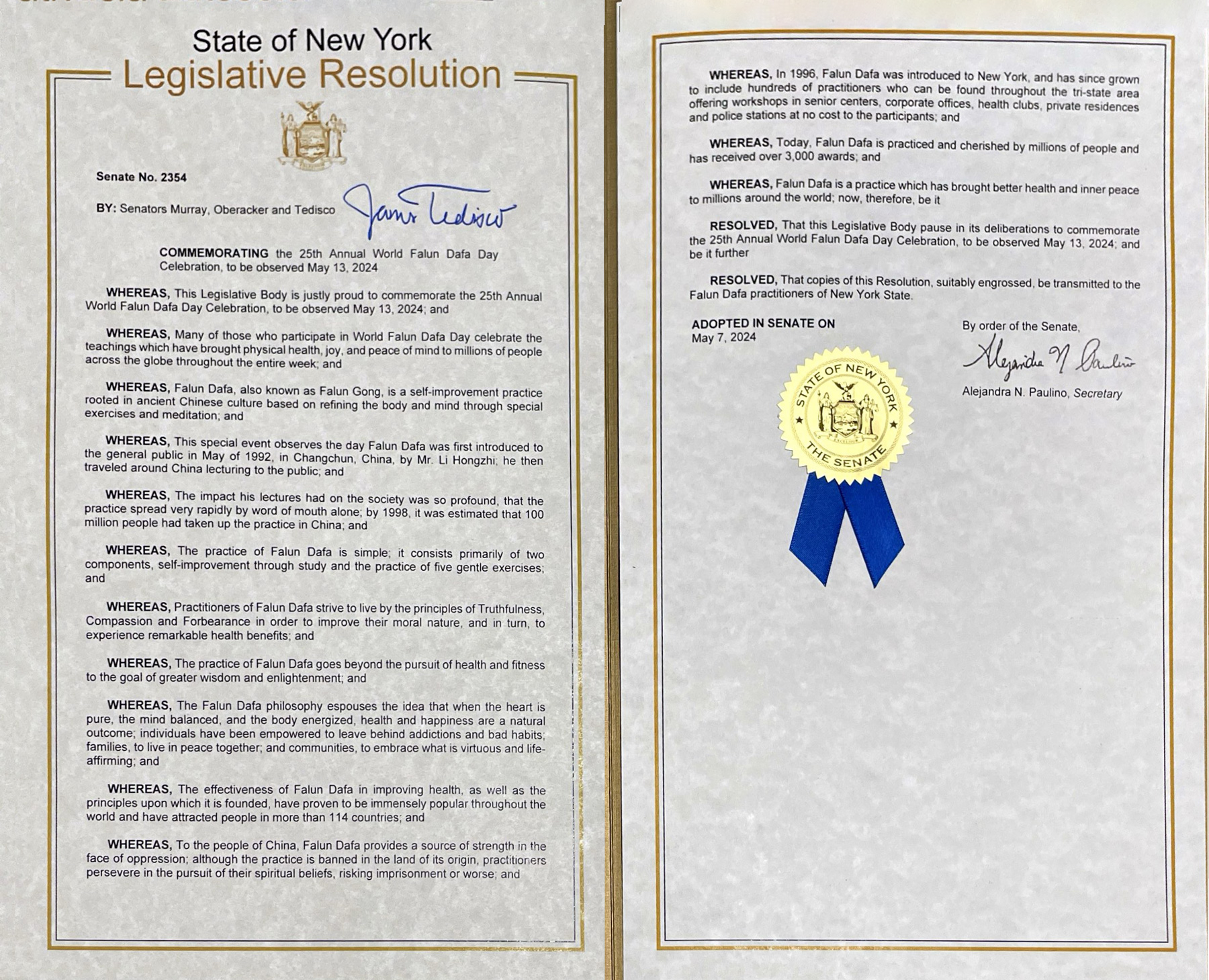 Rezolucija 2354 Senat države New York glasi, dijelom, “Mnogi od onih koji cijelu sedmicu učestvuju u Svjetskom danu Falun Dafa slave ova učenja koja su donijela fizičko zdravlje, radost i duševni mir milionima ljudi širom svijeta.” Senat države New York je 12 uzastopnih godina donosio rezolucije za obilježavanje Svjetskog dana Falun Dafa.