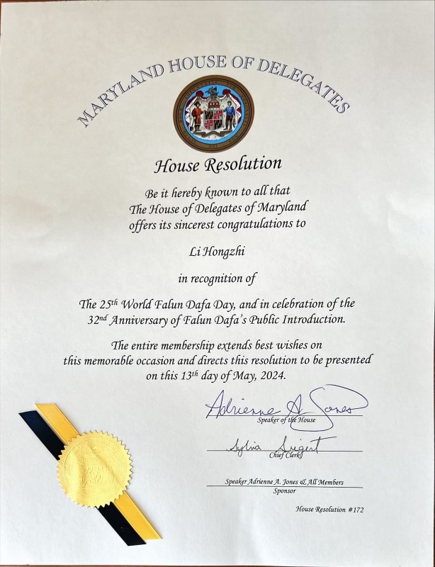 Dom delegata Marylanda donio je rezoluciju 172 koja glasi: „Neka svima bude poznato da Dom delegata Marylanda nudi svoje najiskrenije čestitke Li Hongzhiju u znak priznanja 25. Svjetskog dana Falun Dafa i proslave 32. godišnjicu javnog predstavljanja Falun Dafa. Svi članovi šalju svoje najbolje želje povodom ove nezaboravne prilike i upućuje da se ova rezolucija predstavi 13. maja 2024. godine.”