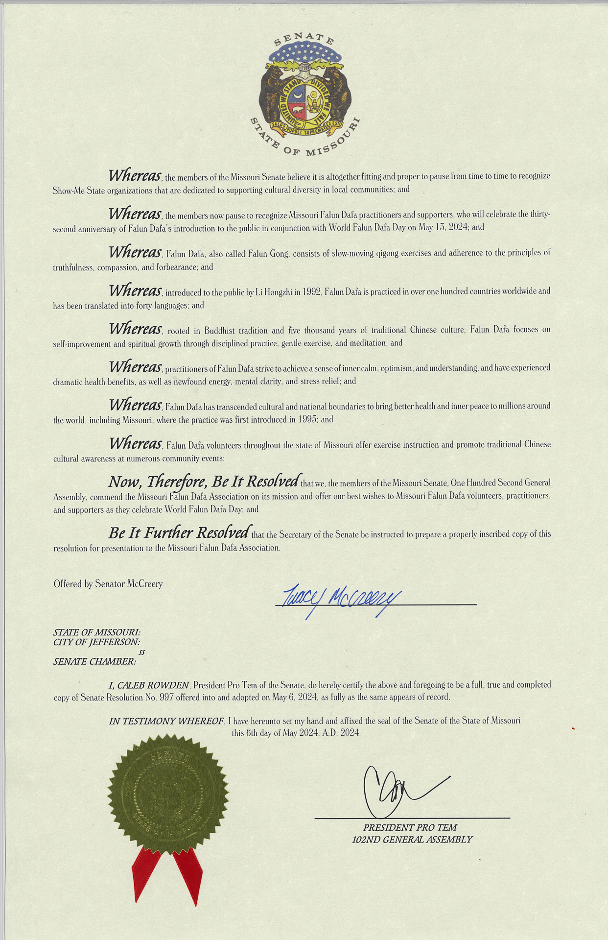 Senat države Missouri je 6. maja, također izdao Rezoluciju 997 u kojoj se navodi da je Falun Dafa javnosti predstavio gospodin Li Hongzhi 1992. godine i da je „Falun Dafa nadmašio kulturne i nacionalne granice kako bi donio bolje zdravlje i unutrašnji mir milionima ljudi širom svijeta uključujući Missouri.”