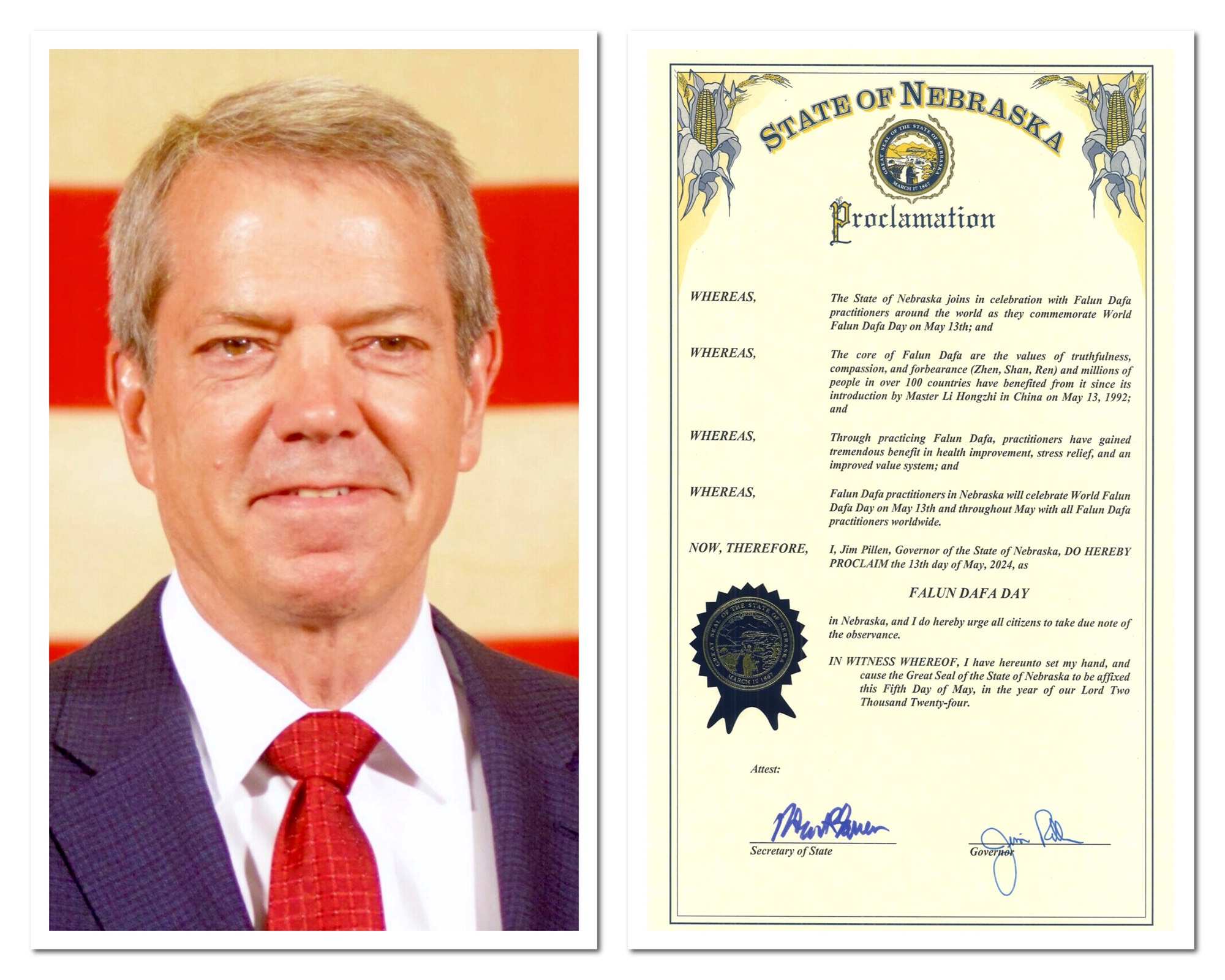 Proglas koji je izdao guverner Nebraske Jim Pillen glasi: “Država Nebraska se pridružuje proslavi sa Falun Dafa praktikantima širom svijeta dok obilježavaju Svjetski dan Falun Dafa 13. maja.”