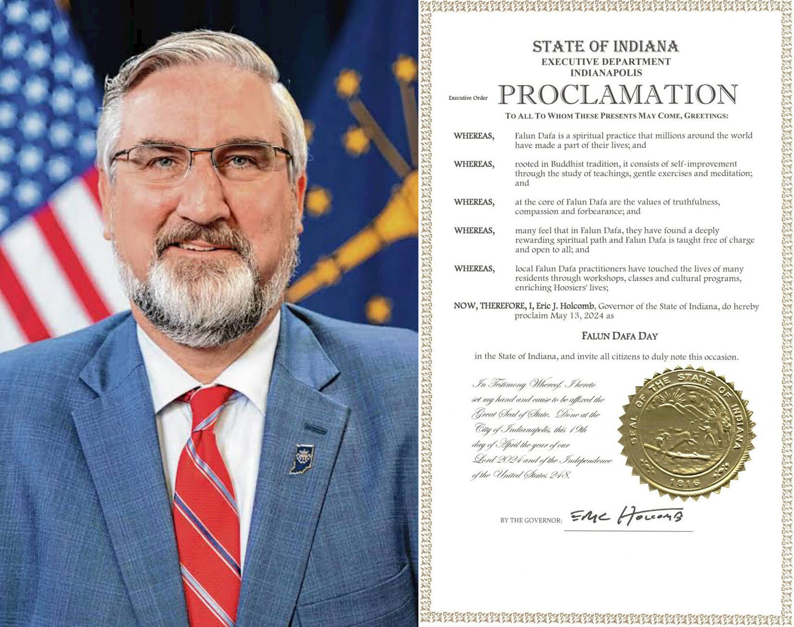 Proglas guvernera Erica Holcomba iz države Indijana glasi: “Falun Dafa je duhovna praksa koju su milioni širom svijeta učinili dijelom svog svakodnevnog života... Mnogi smatraju da su u Falun Dafa pronašli duboko nagrađujući duhovni put a Falun Dafa se predaje besplatno i otvoren je za sve.”