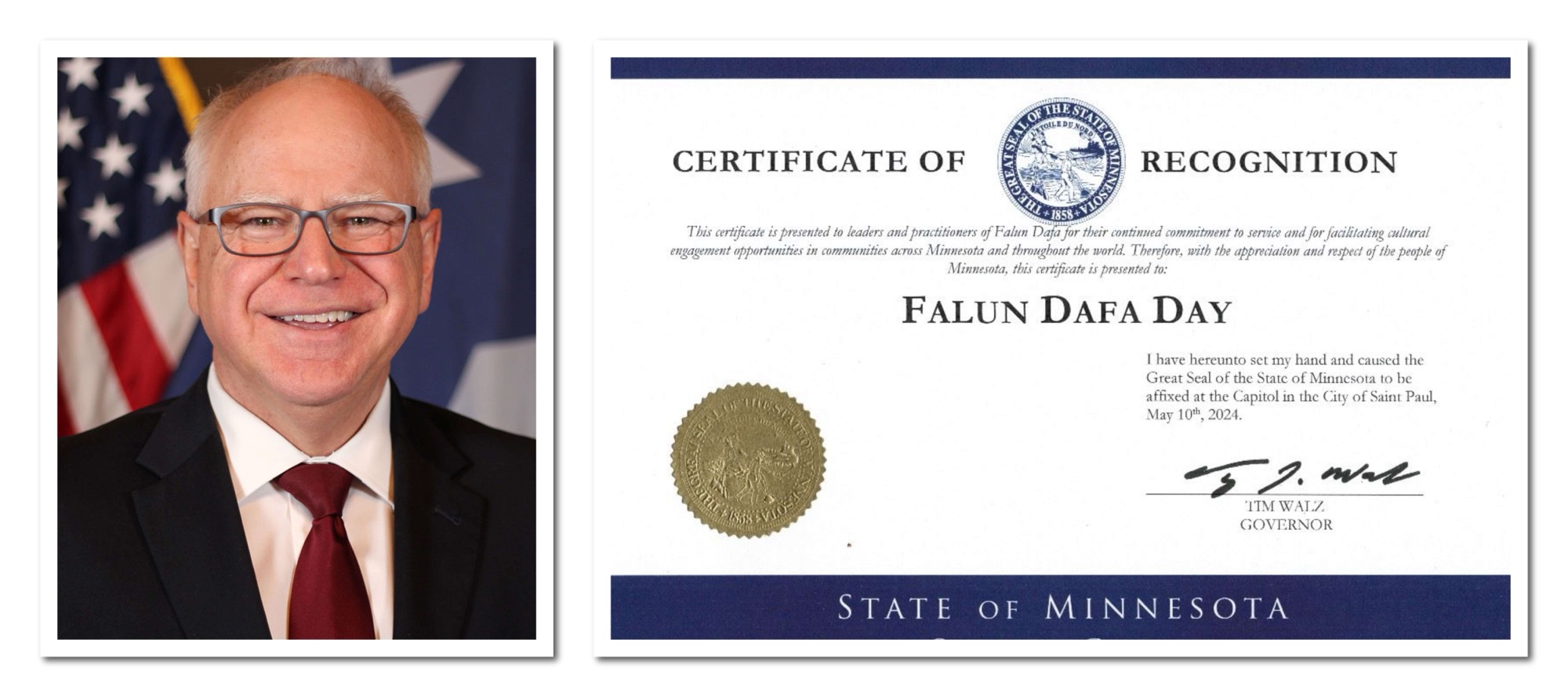 Guverner Tim Walz iz države Minnesota je 10. maj aizdao potvrdu o priznanju za Dan Falun Dafa. Certifikat glasi: „Ovaj certifikat se daje vođama i praktikantima Falun Dafa za njihovu kontinuiranu posvećenost služenju i za omogućavanje pružanja kulturnog angažmana u zajednicama širom Minesote i širom svijeta. Stoga, uz uvažavanje i poštovanje naroda Minnesote, ovaj certifikat je predstavljen: Falun Dafa danu.”