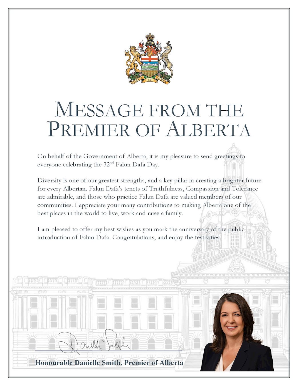 Premijerka, Danielle Smith, je napisala: “Falun Dafa načela Istinitosti, Dobrodušnosti i Tolerancije su vrijedna divljenja, a oni koji prakticiraju Falun Dafu su cijenjeni članovi naših zajednica. Cijenim vaš doprinos tome da Alberta postane jedno od najboljih mjesta na svijetu za život, rad i podizanje obitelji.”