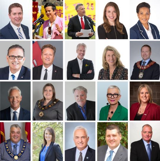 Četvrti red s lijeva na desno: Richard Norcross (gradonačelnik New Tecumsetha), Jennifer Coughlin (gradonačelnica Springwatera), Mario G. Racco (vijećnik grada Vaughana), Matt Mahoney (vijećnik za Ward 8, Mississauga) i Brad Butt (gradski vijećnik Mississauge, odjel 11)