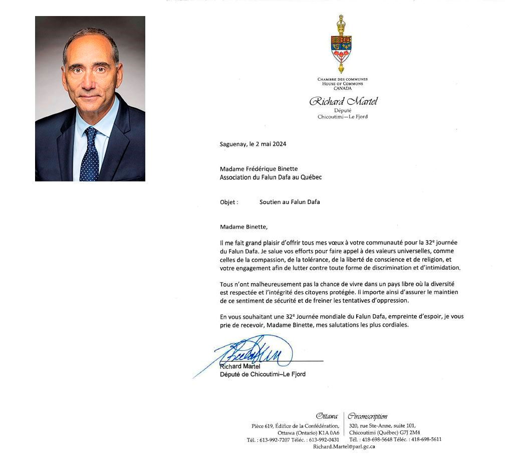 U svom pismu čestitke, Richard Martel, zakonodavac iz Chicoutimi-Le Fjorda u Quebecu, pohvalio je praktikante za obranu univerzalnih vrijednosti Istinitosti-Dobrodušnosti-Tolerancije i slobode vjerovanja: