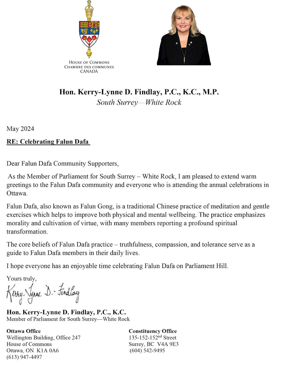 Ted Falk, član parlamenta za Provencher, napisao je: “Falun Gong dijeli mnoge vrijednosti slične mojoj vlastitoj kršćanskoj vjeri: istinitost, dobrodušnost, tolerancija i miroljubivi zajednički suživot sa svima.