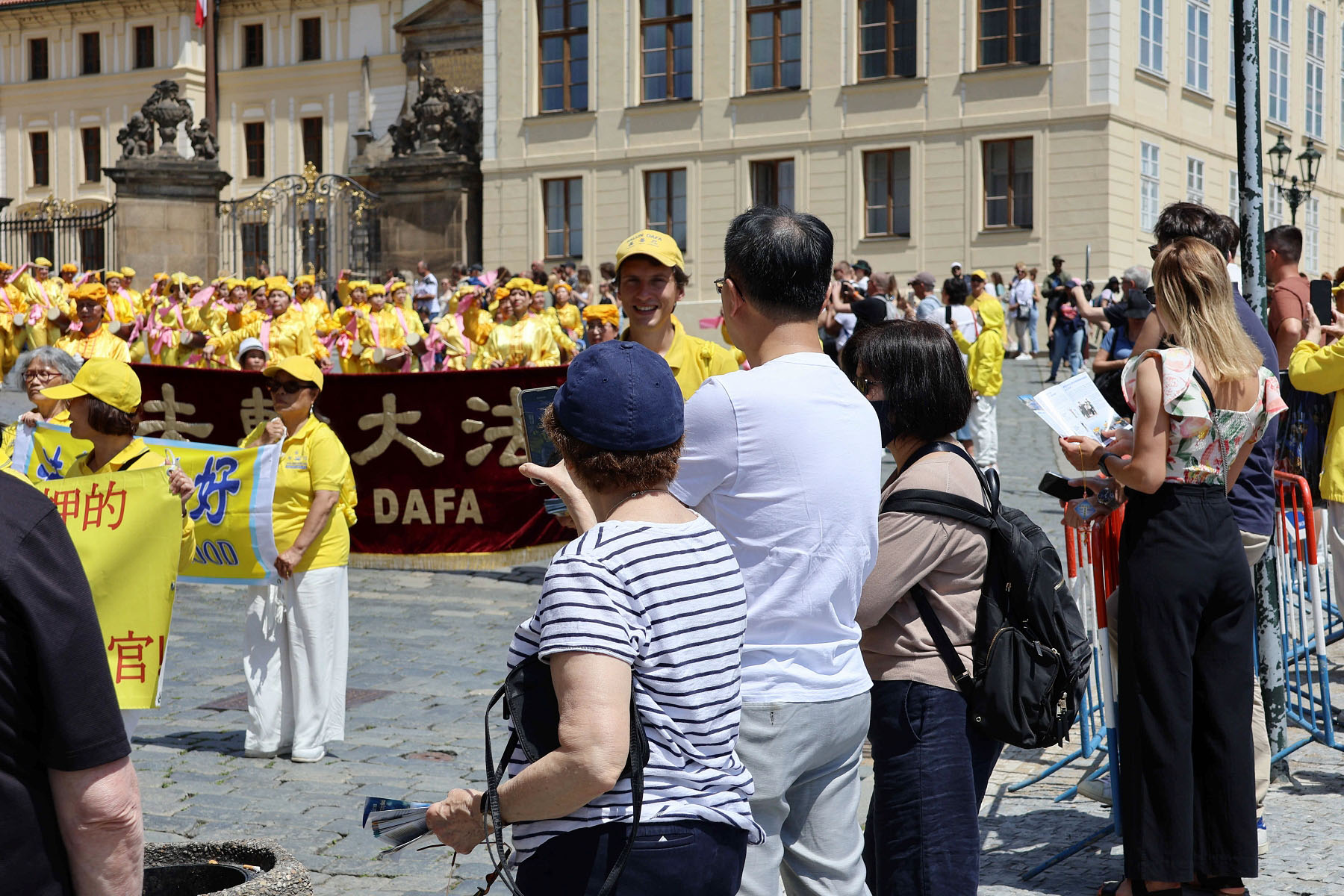 Sunčanog 8. juna, brojni turisti su se okupili na Hradčanskom trgu kako bi posjetili Praški dvorac i gledali smjenu straže. Za razliku od gužve u Zamku, grupa Falun Dafa praktikanata obučenih u žute košulje tiho je na uglu trga meditirala uz umirujuću muziku.