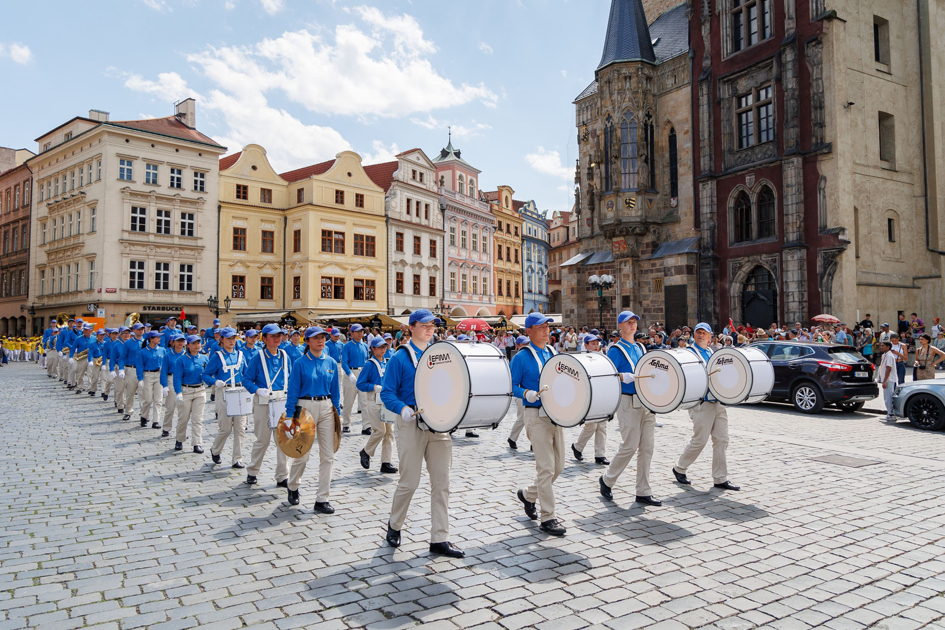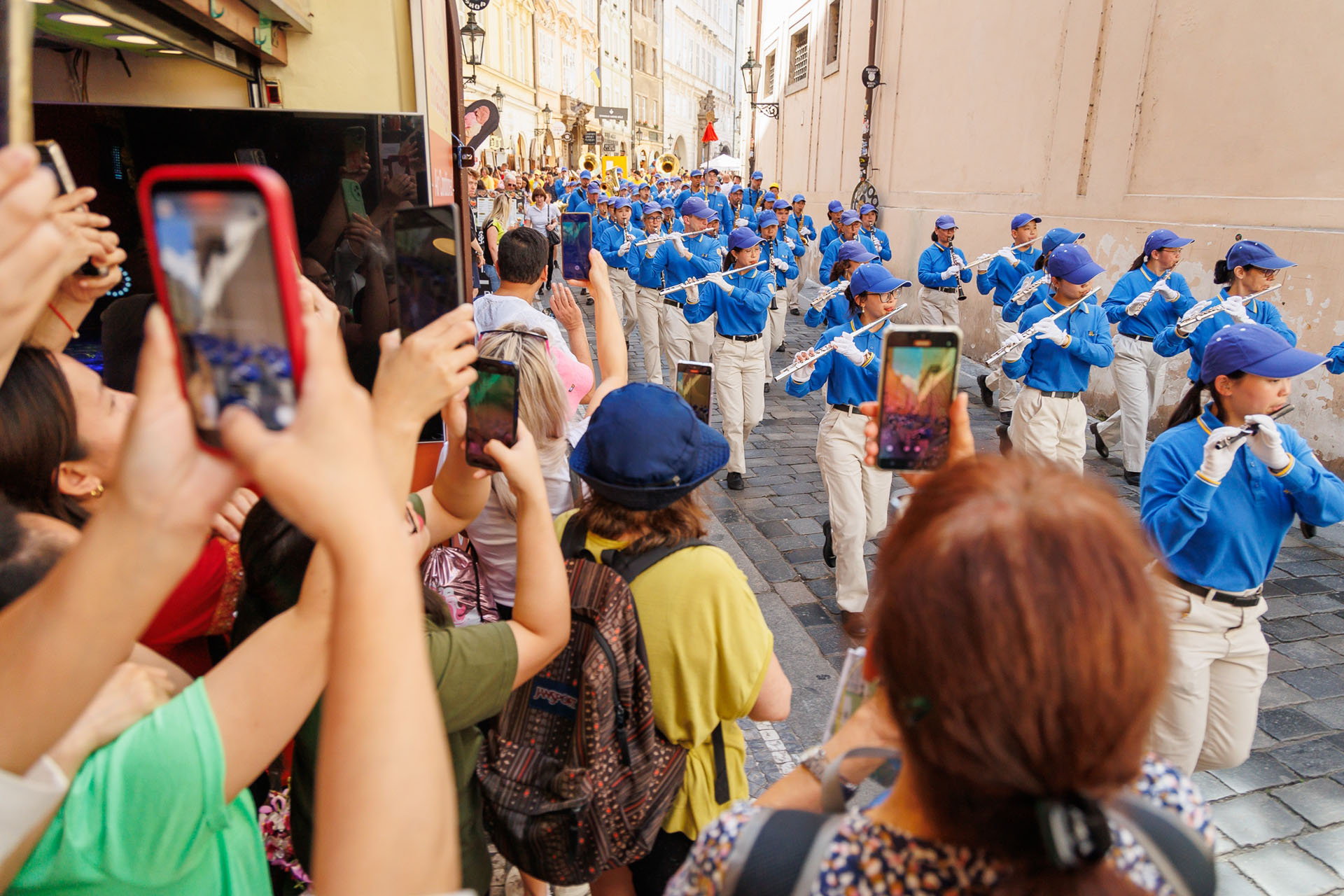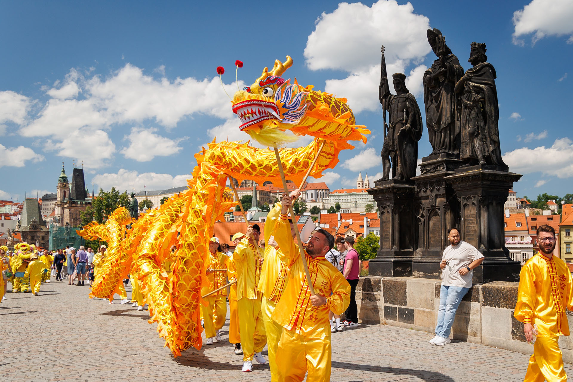 Parada je krenula sa Hradčanskog trga, prešla Karlov most i na kraju stigla do Starog gradskog trga gdje su praktikanti izveli razne izvedbe. Mnogi turisti su se fotografisali sa muzičarima Tian Guo Marching Banda, modelom knjige Zhuan Falun i transparentima sa zlatnim kineskim slovima za “Istinitost, Dobrodušnost i Toleranciju.”