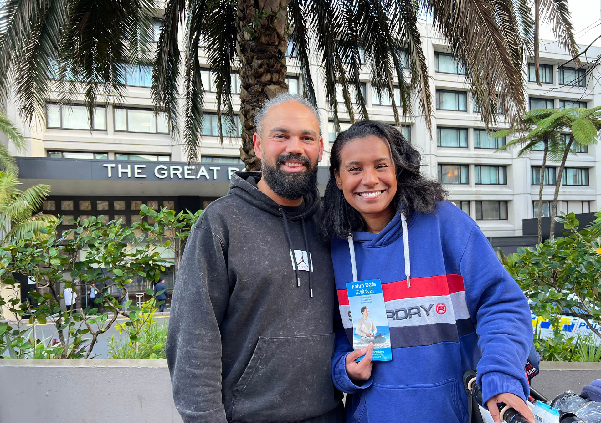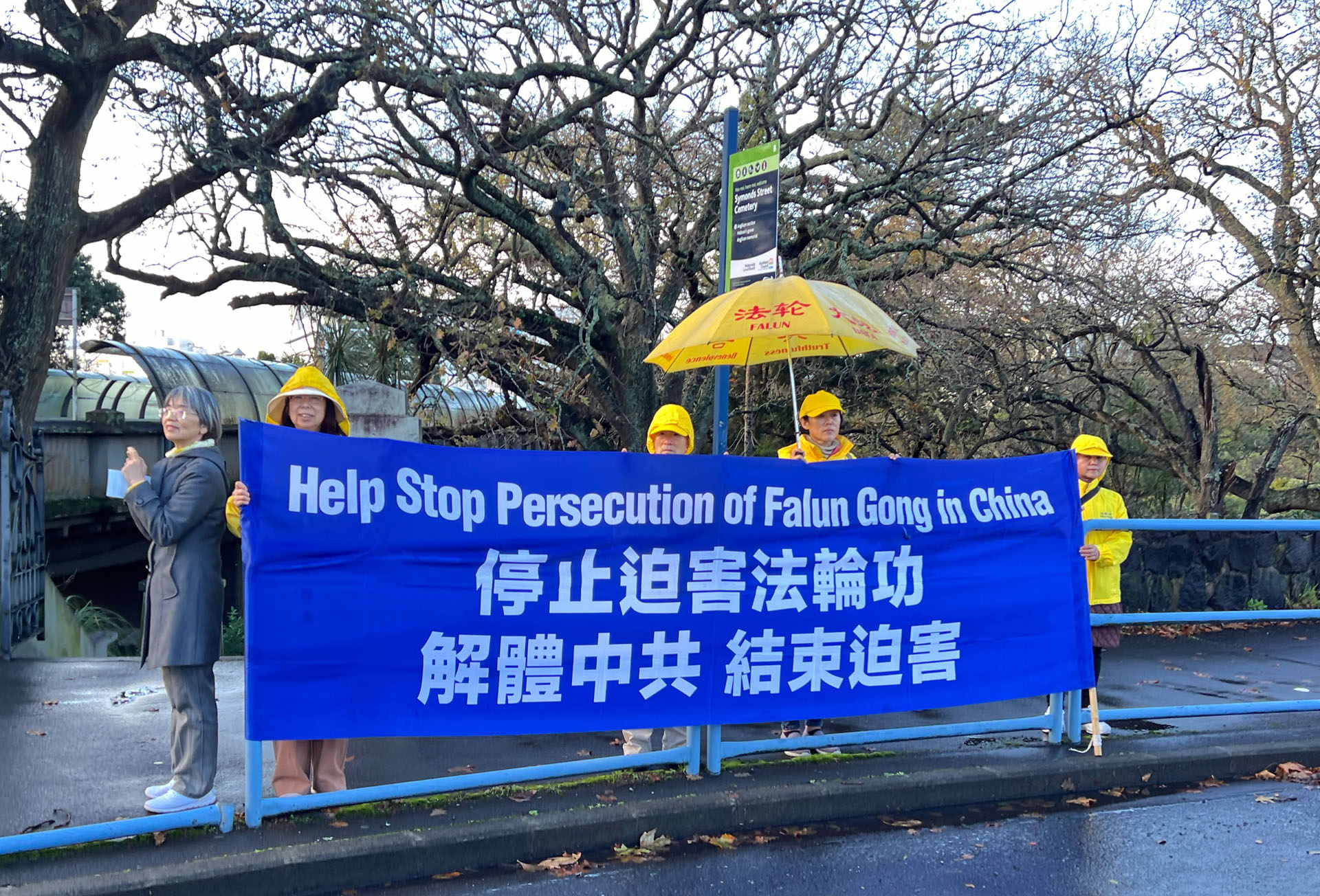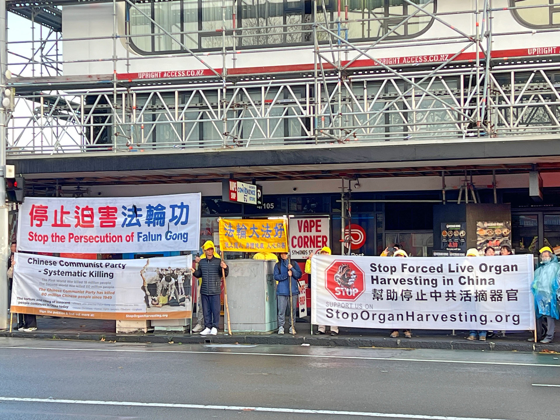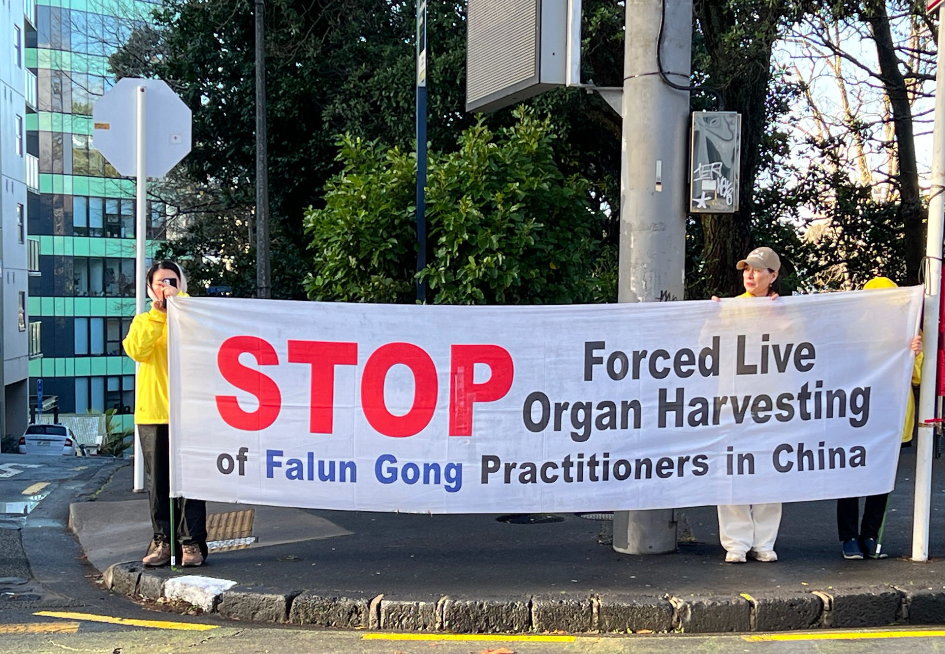 Novi Zeland se nalazi na južnoj hemisferi i usred je zime. Tijekom događaja bilo je hladno, vjetrovito i kišovito vrijeme. Praktikanti su mirno prosvjedovali na vjetru i kiši. Kinesko veleposlanstvo i konzulat angažirali su lokalne pro-KPK Kineze, koji su stigli u nekoliko unajmljenih autobusa i pokušali blokirati transparente praktikanata s kineskim zastavama. Neki od tih ljudi gurali su praktikante; drugi su udarali u gongove i bubnjeve blizu praktikanata; neki su grabili bambusove štapove na kojima su bili pričvršćeni transparenti, dok su drugi noževima rezali transparente. Neki od nasilnika su fizički napali praktikante i odvela ih je novozelandska policija.