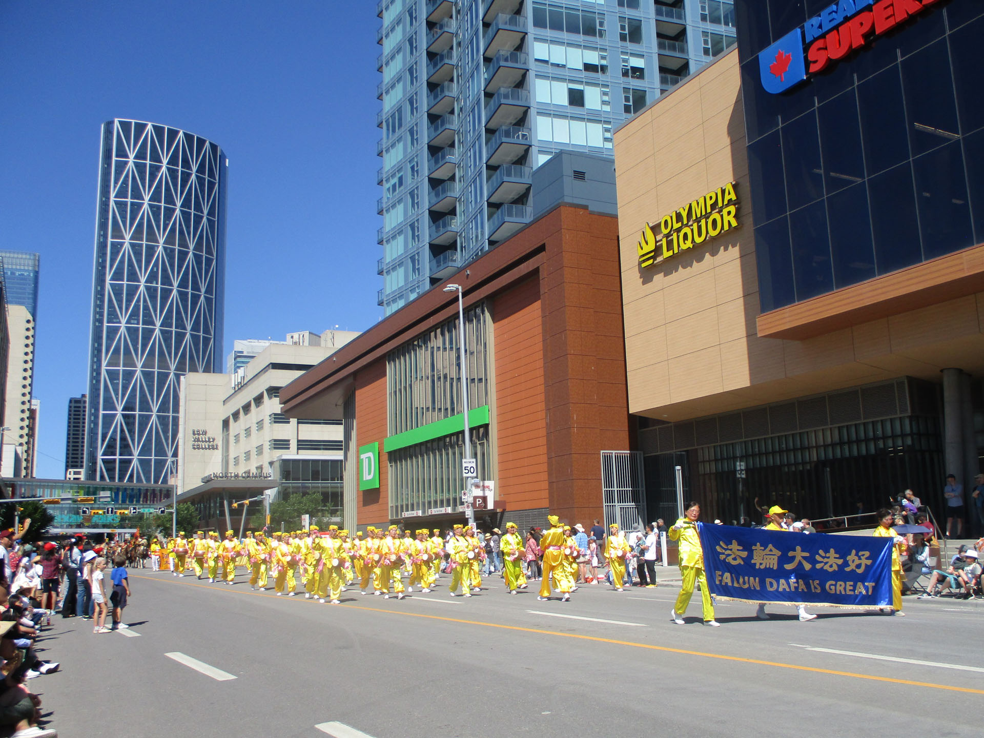 Falun Dafa tim, koji je predstavljao tradicionalnu kinesku kulturu, sastojao se od tri dijela: orkestar Tian Guo Marching Band, velika zlatna maketa broda i tim bubnjara. Članovi benda nosili su plavo-bijele kostime, obnavljajući drevni stil dinastije Tang. Brod je bio ukrašen ružičastim lotosima u punom cvatu i ljubičastim zastavicama s riječima “Istinitost, Dobrodušnost, Strpljivost.” Na brodu su praktikantice obučene poput vila sjedile u meditaciji, a druge su izvodile vježbe stojeći. Tim bubnjara u žutoj odjeći i ružičastim pojasevima marširao je uz glazbu.