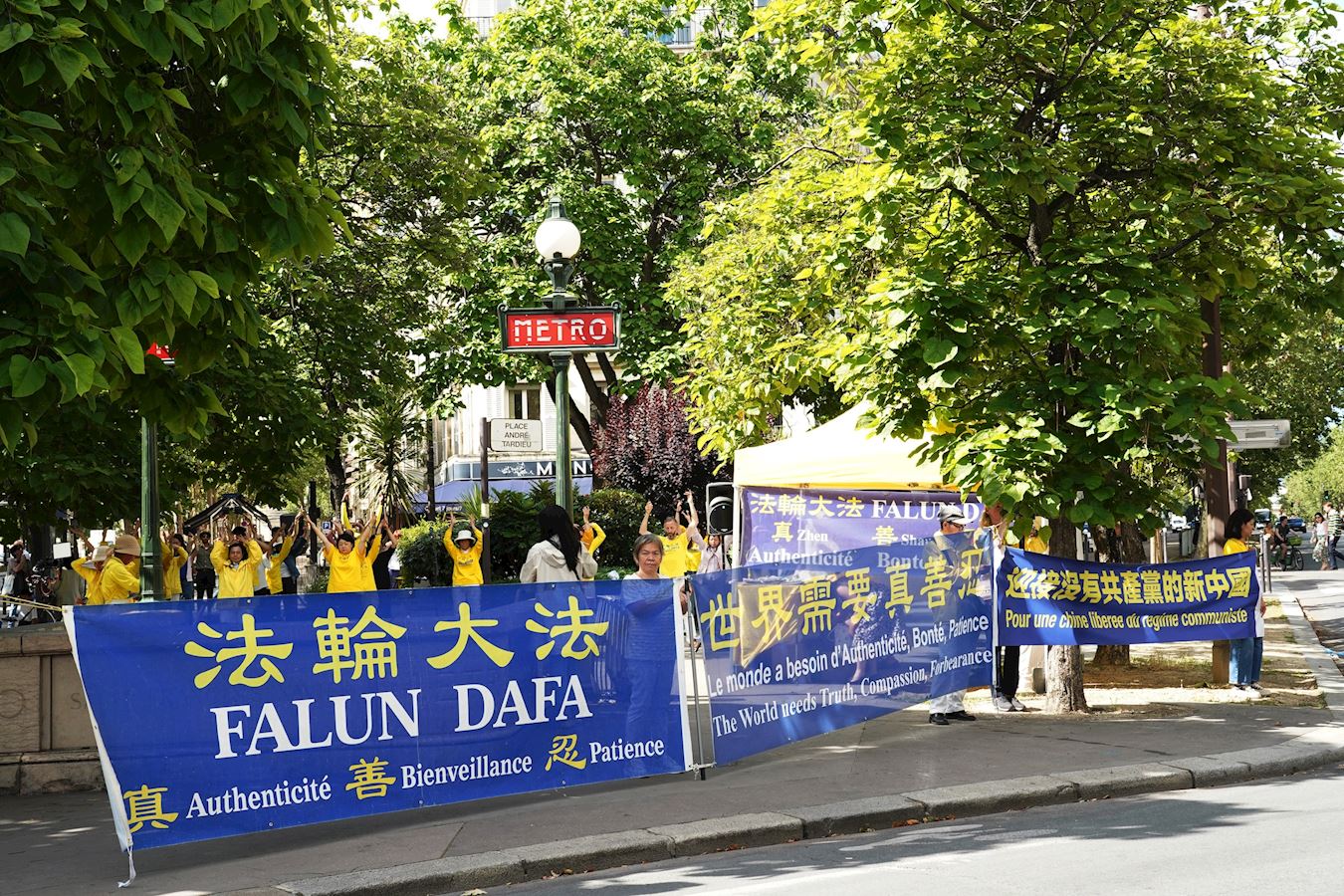Da bi obilježili 25. godišnjicu progona, Falun Gong praktikanti su, 13. jula 2024., održali skup u blizini kineske ambasade u Parizu. Oni su demonstrirali izvođenje pet vježbi i predstavili principe Istinitost, Dobrodušnost i Tolerancija. Oni su također razotkrili zločine žetve organa počinjene od strane Komunističke partije Kine (KPK), što je navelo mnoge ljude da potpišu peticiju kojom se poziva na okončanje zločina.