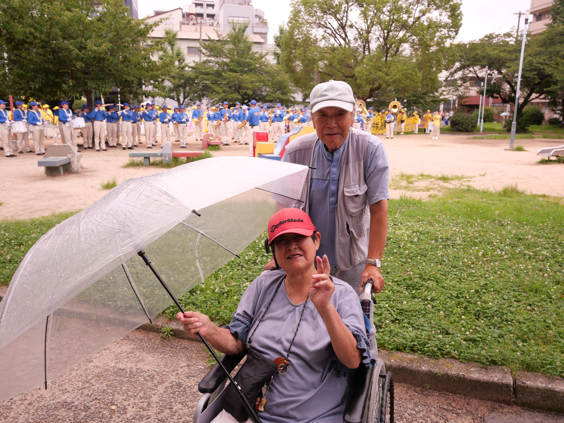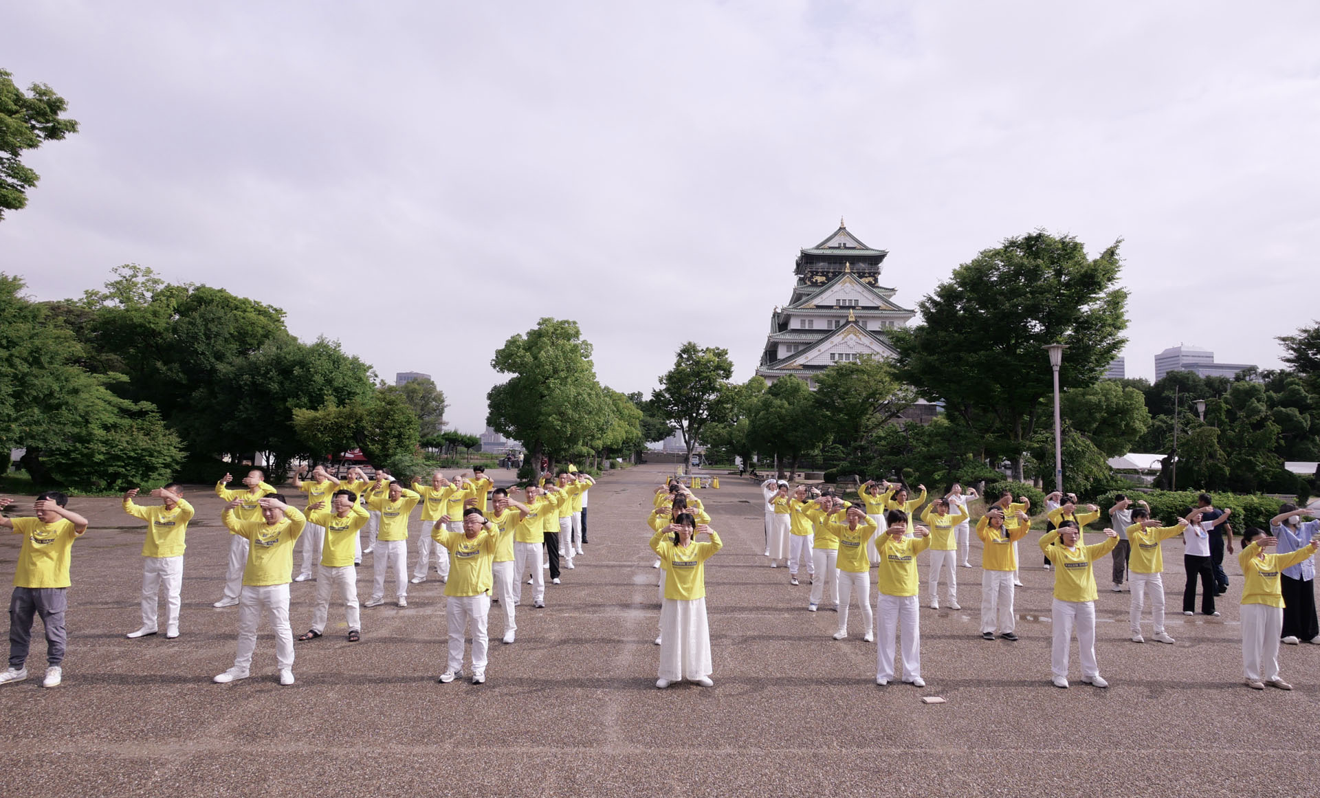 Pre marša 14. jula, praktikanti su ujutru održali grupne vežbe u parku zamka Osaka. Mnogi turisti su bili impresionirani mirnim prizorom. Neki su se slikali ili prihvatili materijale. Sem sa Filipina je naučio vežbe i rekao da su veoma dobre.