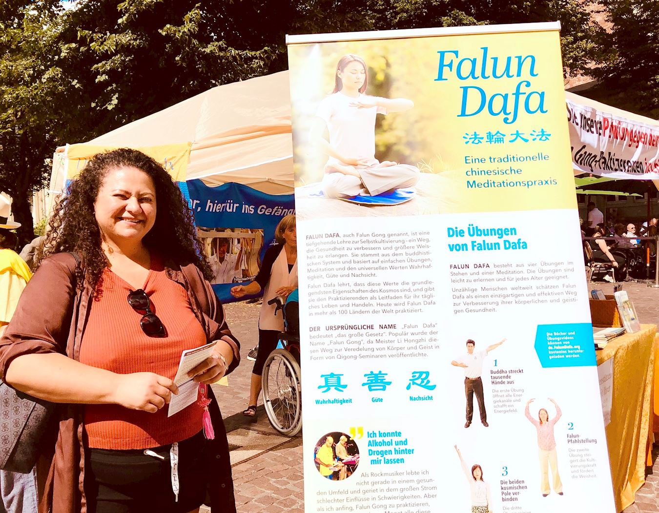 Monicá Oliveira, rođena Brazilka, dugo je živjela u Njemačkoj i vlasnica je agencije za zapošljavanje i agencije za učenje jezika. Gledala je demonstraciju vježbe i čitala plakate koji su ilustrirali progon i razne načine mučenja. Zatim je potpisala peticiju kojom poziva na prestanak progona.