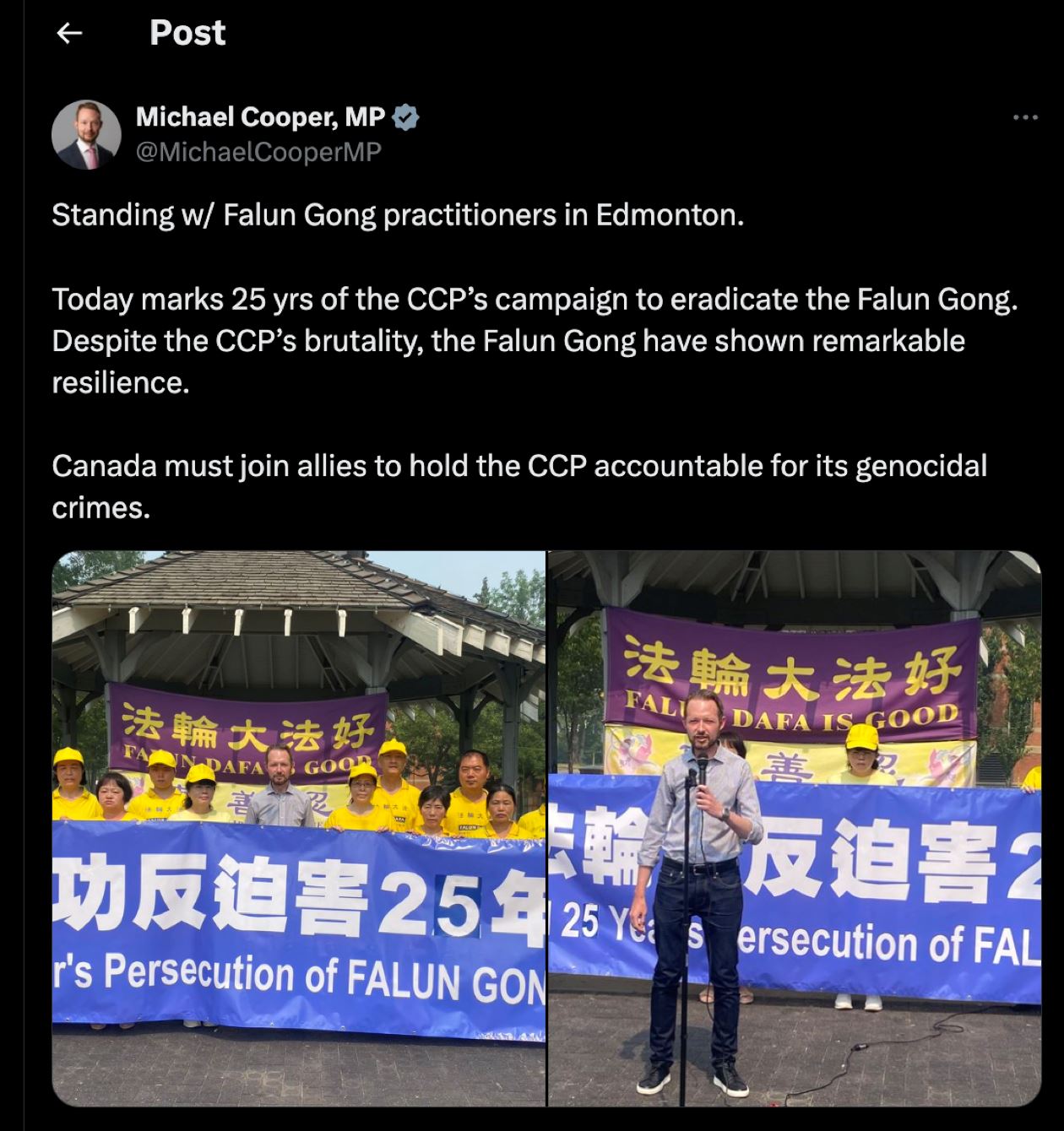“Danas je 20. srpnja mračan dan, ali još uvijek ima nade jer je to borba dobra i zla. Suočavamo se sa zlim komunističkim političkim režimom i Falun Dafom koja predstavlja dobrotu. Vjerujem da će Istinitost, Dobrodušnost, Tolerancija na kraju prevladati.” Objavio je fotografiju svoje prisutnosti na skupu u Edmontonu na X i napisao: “Unatoč brutalnosti KPK, Falun Gong je pokazao nevjerojatnu otpornost. Kanada se mora pridružiti saveznicima kako bi KPK smatrala odgovornom za svoje genocidne zločine.”