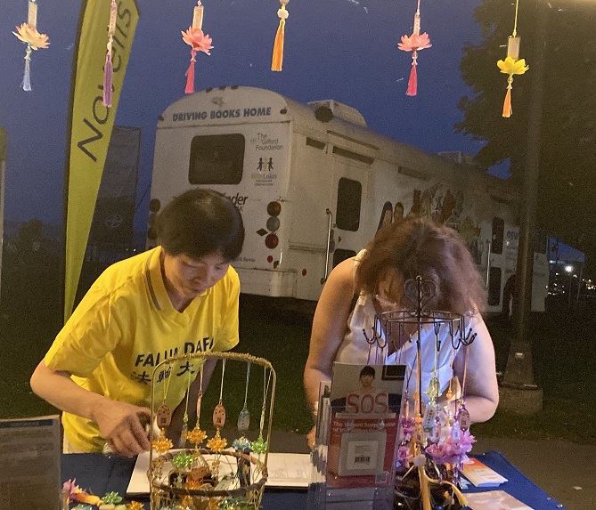 Jedna je praktikantica s posjetitljkom podijelila iskustvo kako je postala zdrava kroz prakticiranje Falun Dafa, ali je bila mučena u Kini jer je odbila da se odrekne svoje vjere. Praktikantica je dirnula ženu objašnjavajući joj da želi pomoći svojim kolegama praktikantima u Kini i ona je kasnije potpisala peticiju. Zagrlila je praktikanticu kako bi joj pokazala podršku.