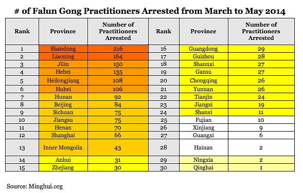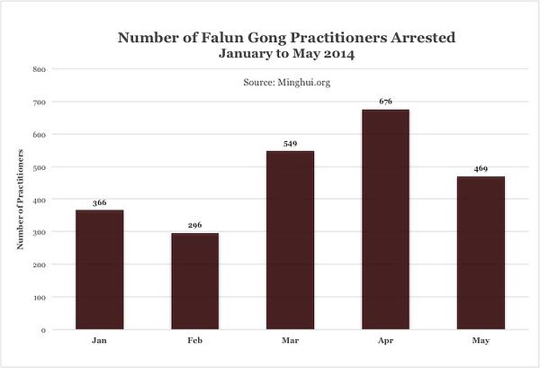 S izuzetkom Tibeta, takvi slučajevi su zabilježeni u svim provincijama, izdvojenim gradovima te autonomnim pokrajinama u Kini. Broj uhićenih Falun Gong praktikanata naglo je porastao od ožujka ove godine. Prema informacijama dobivenim do 3. lipnja, 1694 praktikanata je uhićeno od ožujka do svibnja 2014., što predstavlja povećanje od 30% u odnosu na isto razdoblje prošle godine.