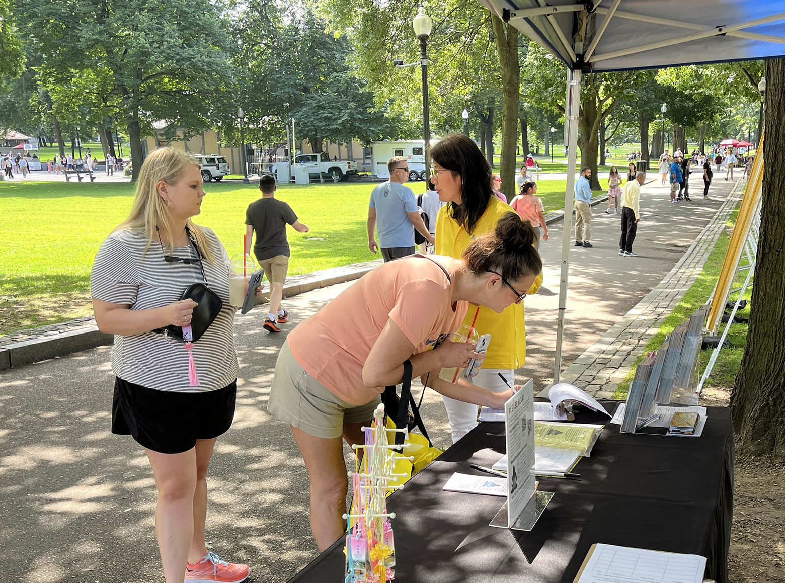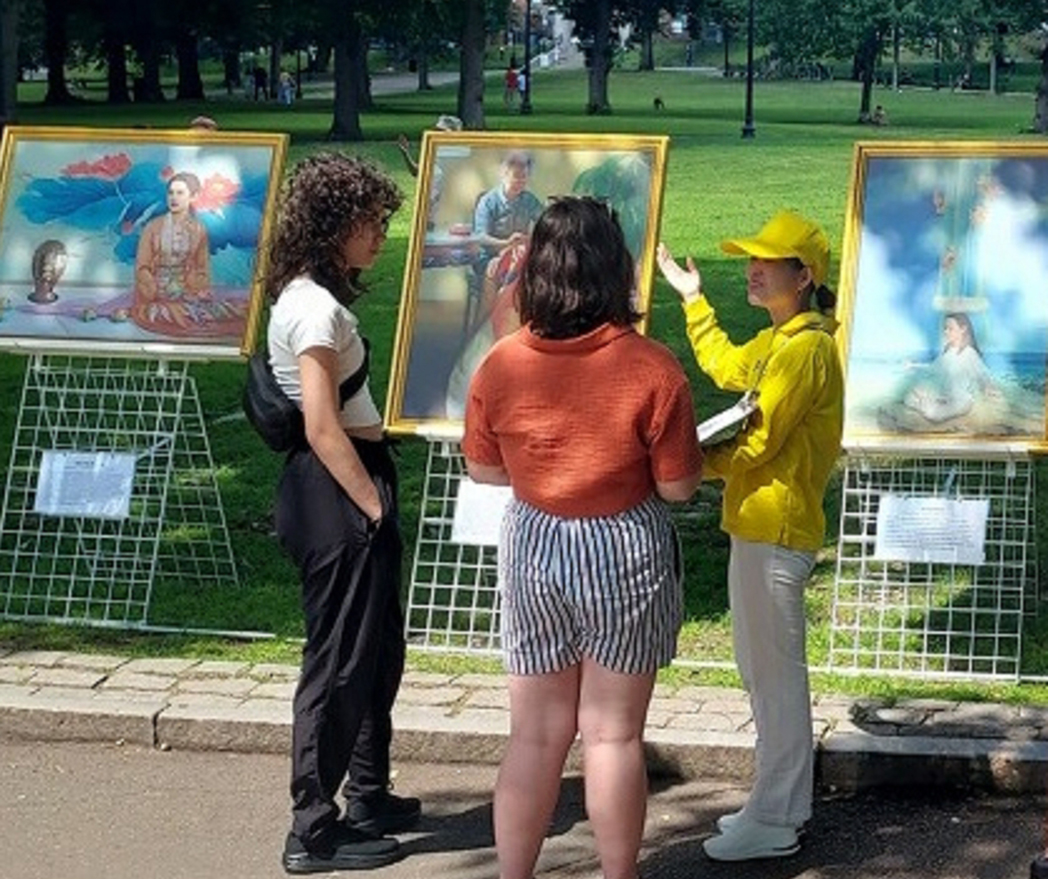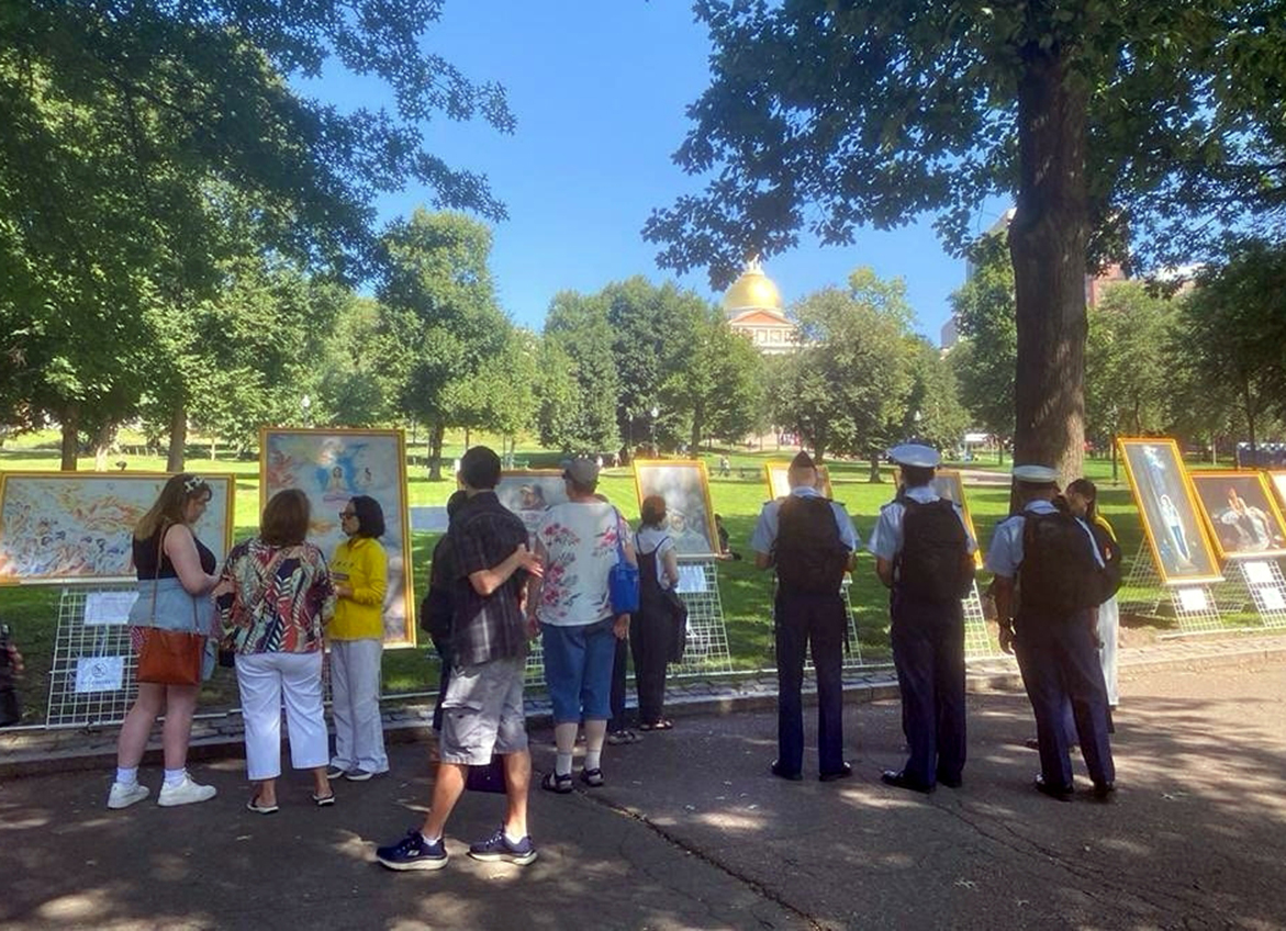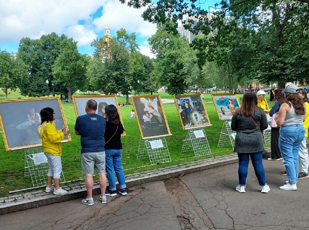 U parku u centru Bostona, Boston Commons, praktikanti Falun Dafe su održali šestodnevnu međunarodnu izložbu “Umetnost Džen, Šan, Rena” (Istina, saosećanje, strpljivost) Izložba je završena 24. avgusta 2024. godine i ostavila je nezaboravan utisak na građane i turiste koji su hvalili umetnička dela zbog njihove estetike i dubokog značenja. Mnogi ljudi su rekli da su ih slike inspirisale i pohvalili su istrajnost praktikanata u održavanju svoje vere.