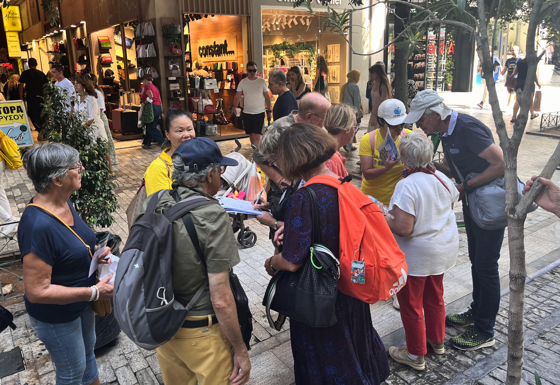 Parada je prolazila i pored turističkih atrakcija i poznatih trgovačkih ulica ispunjenih mještanima i turistima. Mnogi ljudi su fotografisali, aplaudirali, mahali i navijali. Kada se marš nakratko zaustavio na trgu Syntagma i Monastiraki, predstavnik praktikanata je upoznao posmatrače sa Falun Gongom i kazao im za progon koji vrši KPK.