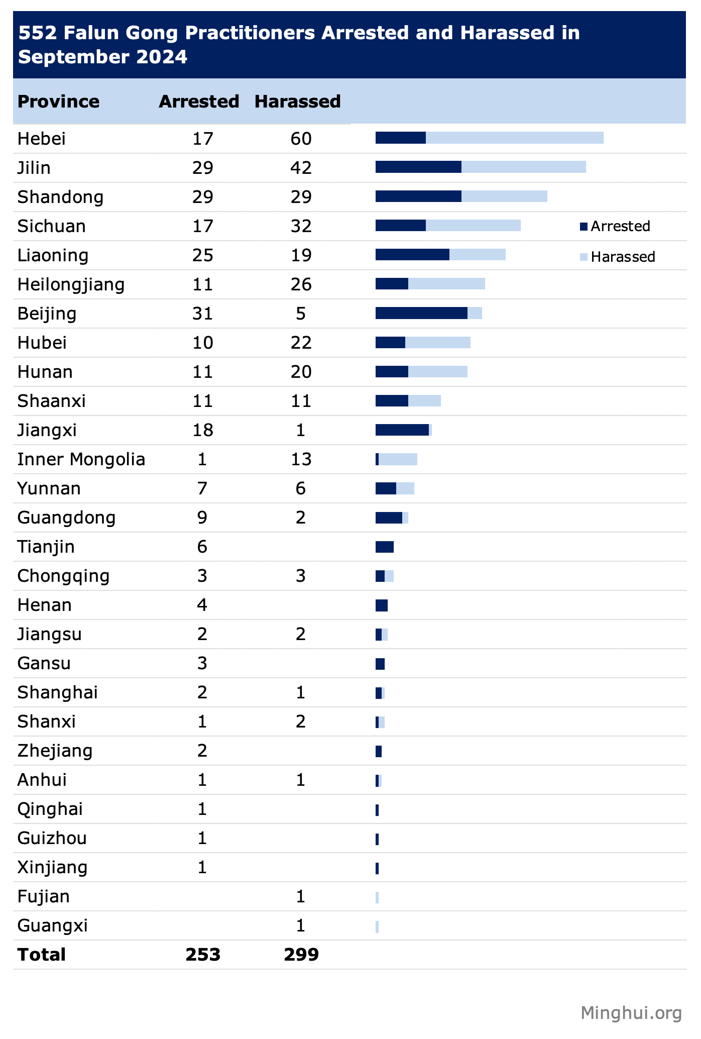 U rujnu 2024. prijavljeno je ukupno 522 slučaja uhićenja ili uznemiravanja Falun Gong praktikanata zbog njihove vjere, uključujući 253 uhićenja i 299 slučajeva uznemiravanja.